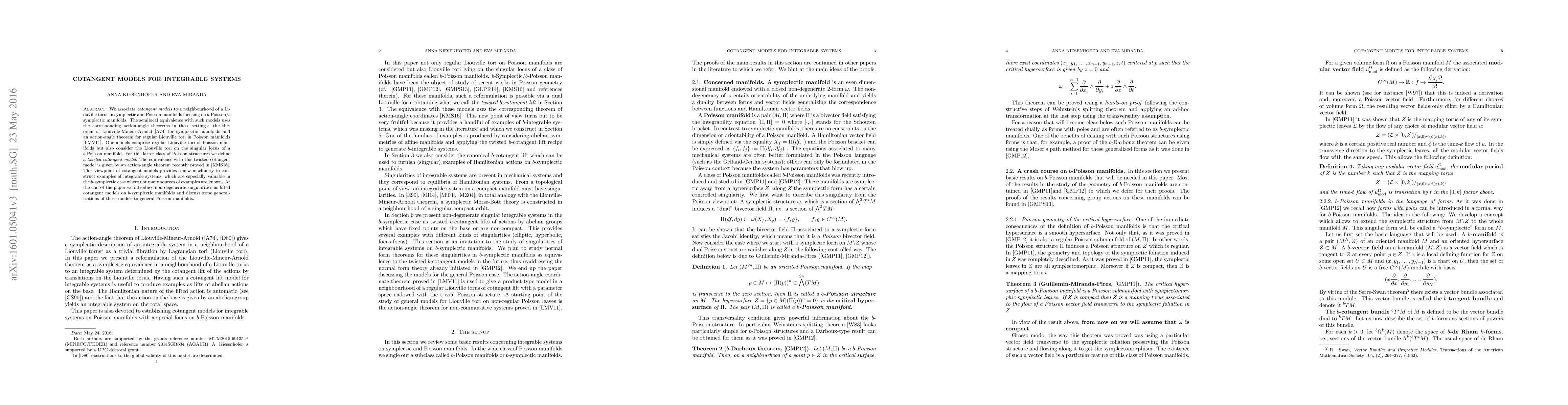The paper introduces cotangent models for integrable systems on symplectic and $b$-symplectic manifolds, extending the Liouville-Mineur-Arnold theorem and an action-angle theorem for Poisson manifolds.