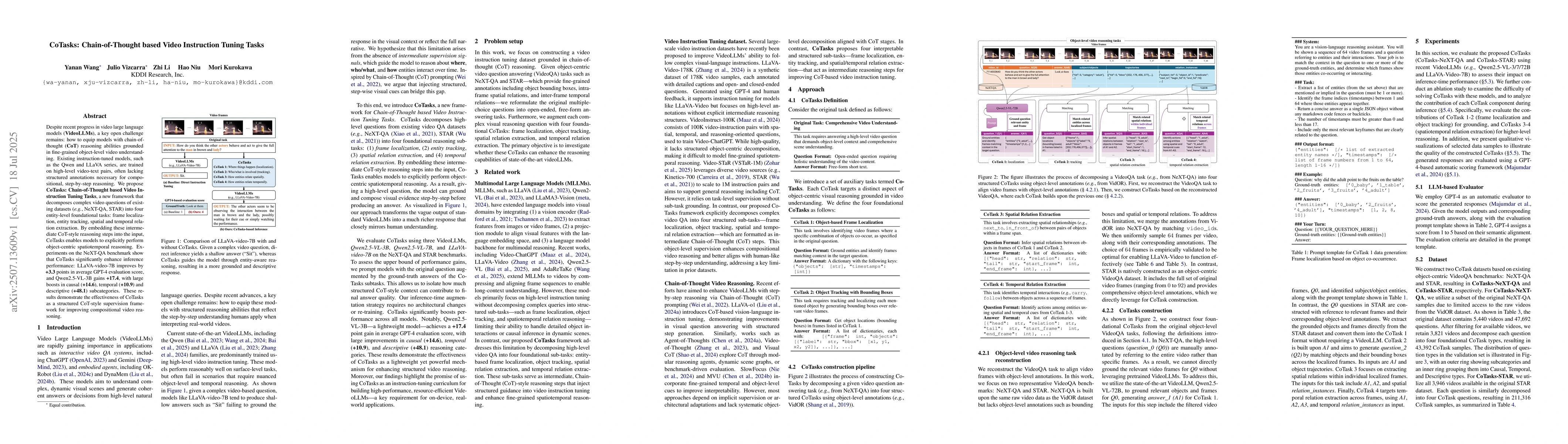 Despite recent progress in video large language models (VideoLLMs), a key open challenge remains: how to equip models with chain-of-thought (CoT) reasoning abilities grounded in fine-grained object-level video understanding. Existing instruction-tuned models, such as the Qwen and LLaVA series, are trained on high-level video-text pairs, often lacking structured annotations necessary for compositional, step-by-step reasoning. We propose CoTasks: Chain-of-Thought based Video Instruction Tuning Tasks, a new framework that decomposes complex video questions of existing datasets (e.g., NeXT-QA, STAR) into four entity-level foundational tasks: frame localization, entity tracking, spatial and temporal relation extraction. By embedding these intermediate CoT-style reasoning steps into the input, CoTasks enables models to explicitly perform object-centric spatiotemporal reasoning. Experiments on the NeXT-QA benchmark show that CoTasks significantly enhance inference performance: LLaVA-video-7B improves by +3.3 points in average GPT-4 evaluation score, and Qwen2.5-VL-3B gains +17.4, with large boosts in causal (+14.6), temporal (+10.9), and descriptive (+48.1) subcategories. These results demonstrate the effectiveness of CoTasks as a structured CoT-style supervision framework for improving compositional video reasoning.