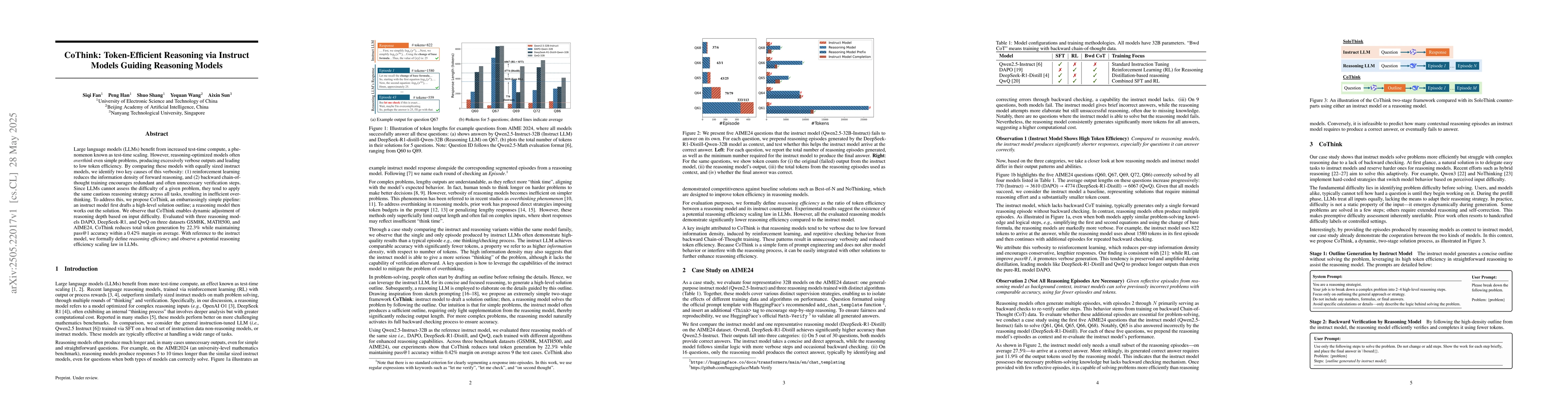 CoThink, a pipeline combining instruct and reasoning models for efficient token-constrained reasoning, enabling dynamic depth adjustment based on problem difficulty.