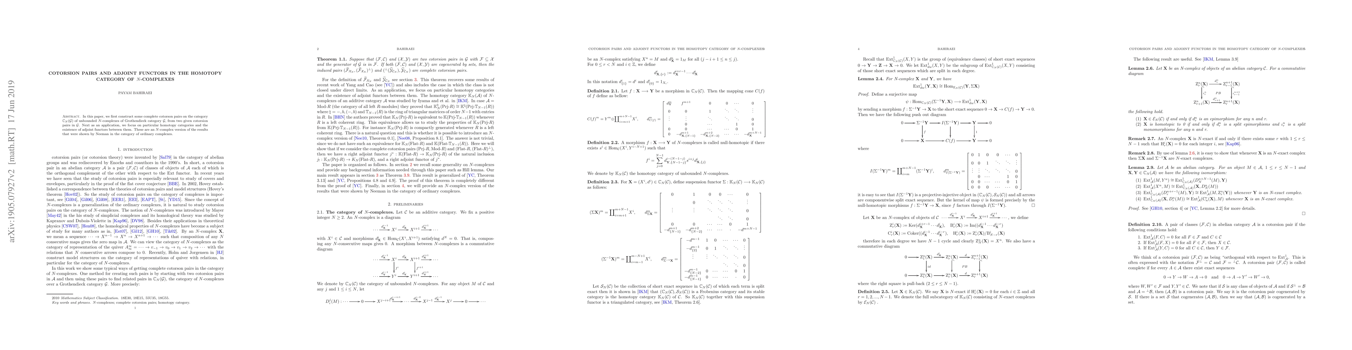 In this paper, we first construct some complete cotorson pairs on the category $\mathbb{C}_N(\mathcal{G})$ of unbounded $N$-complexes of Grothendieck category $\mathcal{G}$, from two given cotorsion pairs in $\mathcal{G}$. Next as an application, we focus on particular homotopy categories and the existence of adjoint functors between them. These are an $N$-complex version of the results were shown by Neeman in the category of ordinary complexes.