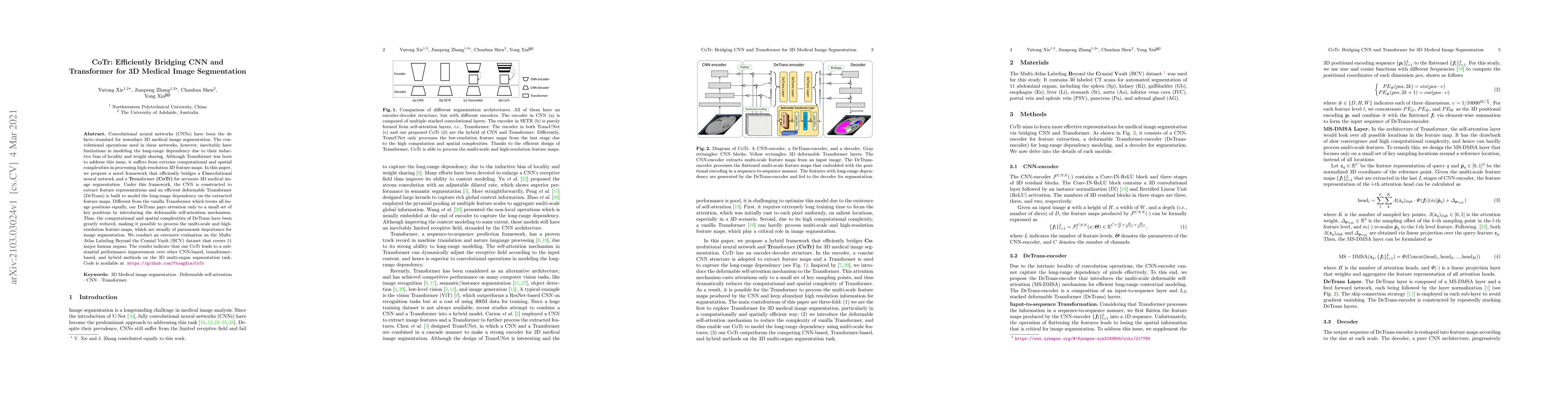 This paper proposes CoTr, a novel framework combining CNNs and a deformable Transformer (DeTrans) for efficient 3D medical image segmentation. The CNN extracts features, while DeTrans models long-range dependencies by focusing on key positions, reducing computational and spatial complexities, and achieving superior segmentation performance on the BCV dataset.