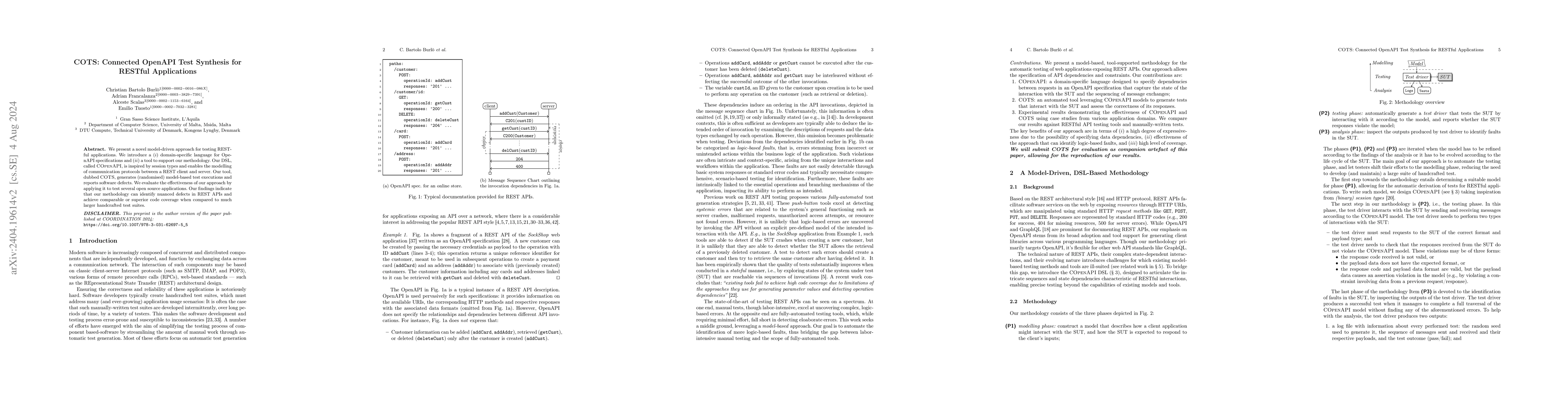 The paper proposes a model-driven testing approach for RESTful applications using a domain-specific language for OpenAPI specifications and a tool called COTS that generates randomized tests and identifies software defects. Evaluations show the methodology effectively finds nuanced defects and achieves comparable or better coverage than larger handcrafted test suites.