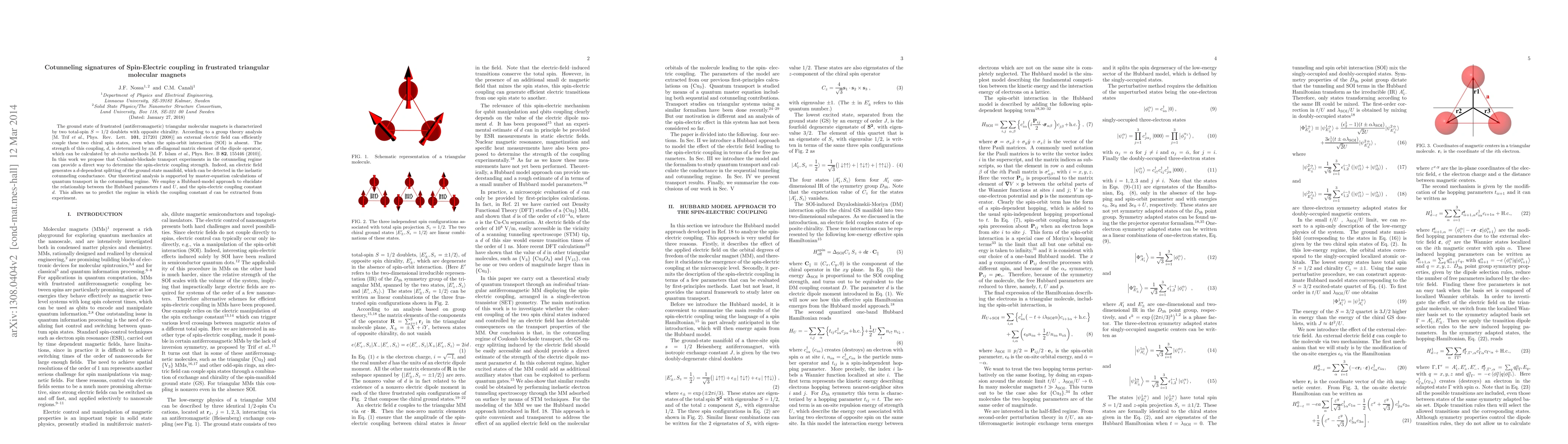 This paper explores how Coulomb-blockade transport in the cotunneling regime can reveal spin-electric coupling in frustrated triangular molecular magnets, proposing that an electric field can split the ground state manifold, detectable via inelastic cotunneling conductance. Theoretical analysis and master-equation calculations support this, linking Hubbard parameters to the spin-electric coupling constant.