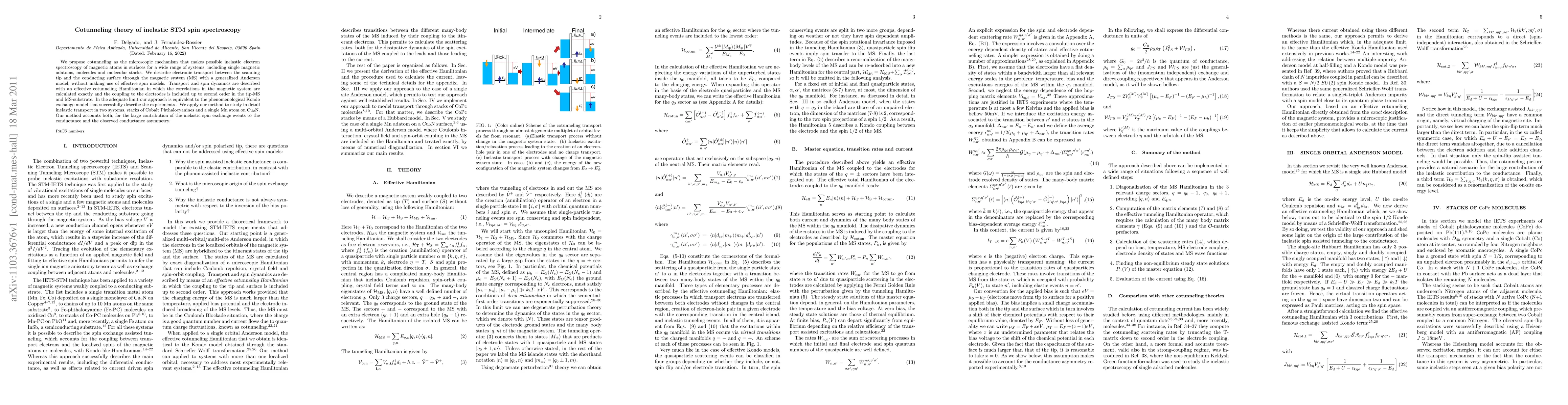 The paper proposes cotunneling as the mechanism for inelastic electron spectroscopy of magnetic atoms on surfaces, applicable to various systems. It uses a generalized Anderson model and an effective cotunneling Hamiltonian to describe transport and spin dynamics, equivalent to the Kondo exchange model. The method accurately accounts for inelastic spin exchange events and conductance asymmetry in systems like Co phthalocyanine stacks and Mn on Cu_2N.