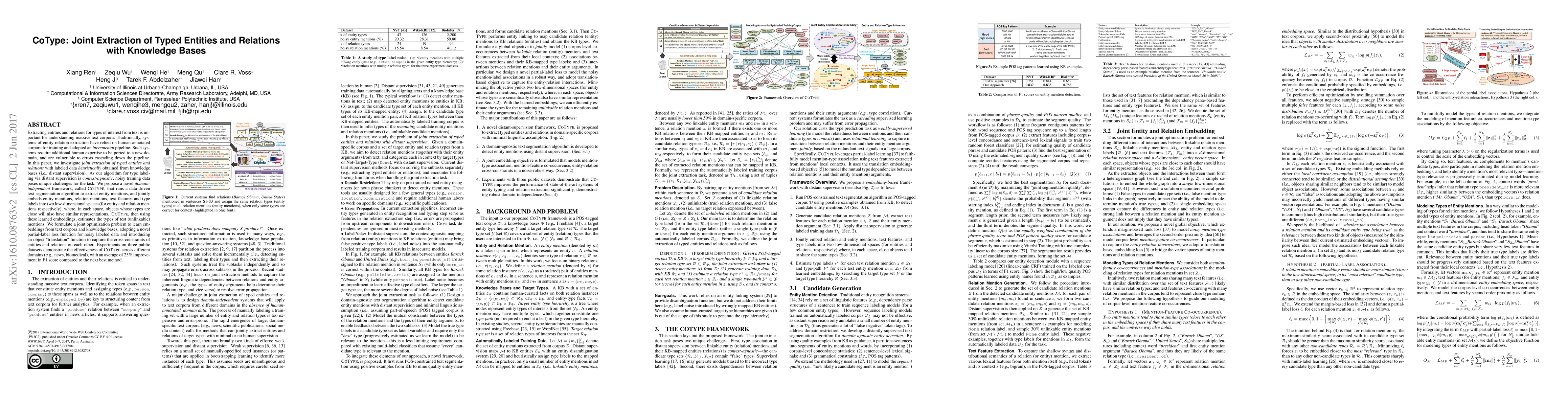 CoType proposes a novel framework for joint extraction of typed entities and relations using knowledge bases for distant supervision, addressing the challenges of noisy training data. It achieves significant improvements in F1 score across various domains by embedding entities and relations into low-dimensional spaces and optimizing embeddings jointly.