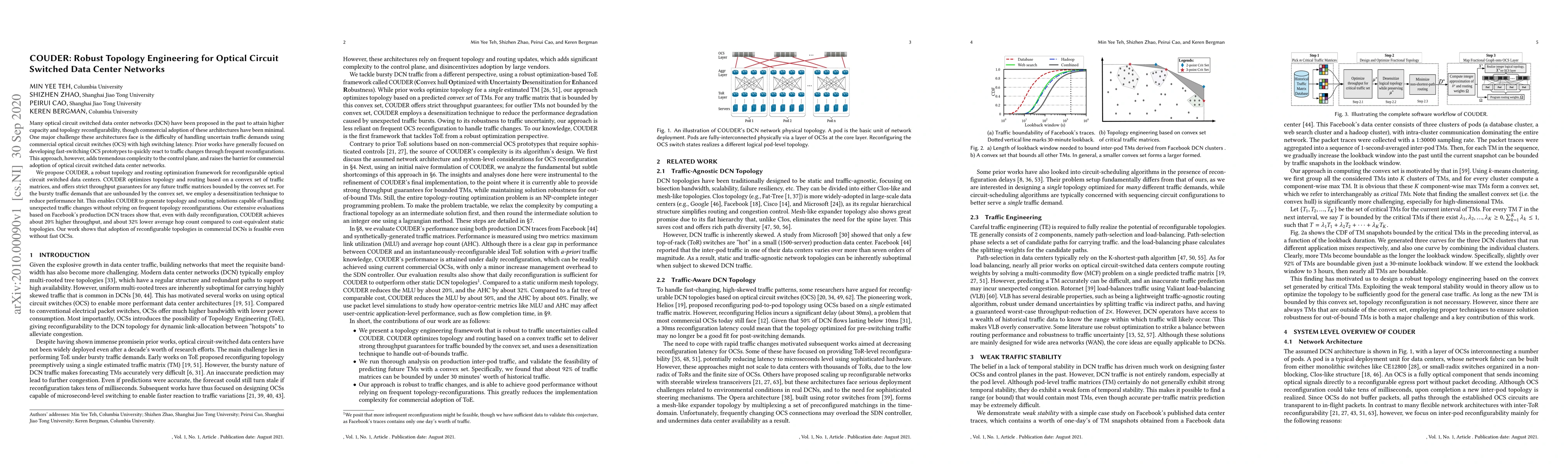COUDER is a framework for optimizing topology and routing in optical circuit switched data center networks, aiming to handle uncertain traffic demands without frequent reconfigurations. It achieves higher throughput and lower average hop counts compared to static topologies, demonstrating the feasibility of reconfigurable networks without relying on fast optical switches.