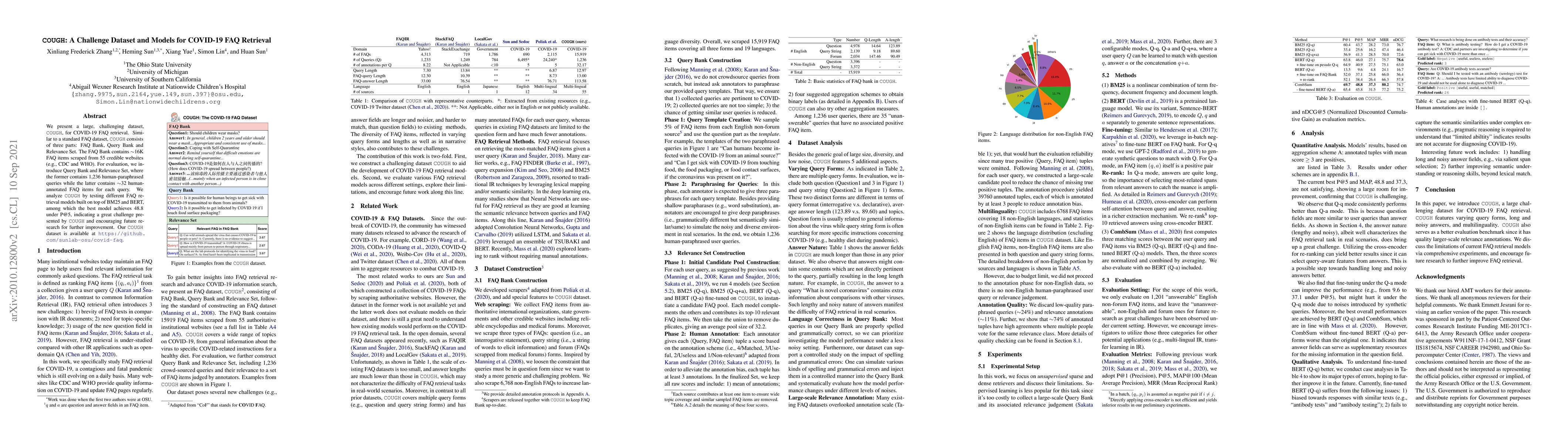 The COUGH dataset, comprising ~16K FAQs from credible sources, 1,236 human-paraphrased queries, and relevance annotations, presents a significant challenge for COVID-19 FAQ retrieval. Models tested on COUGH, including BM25 and BERT-based approaches, achieved a best P@5 score of 48.8, highlighting the dataset's potential for advancing research in this area.