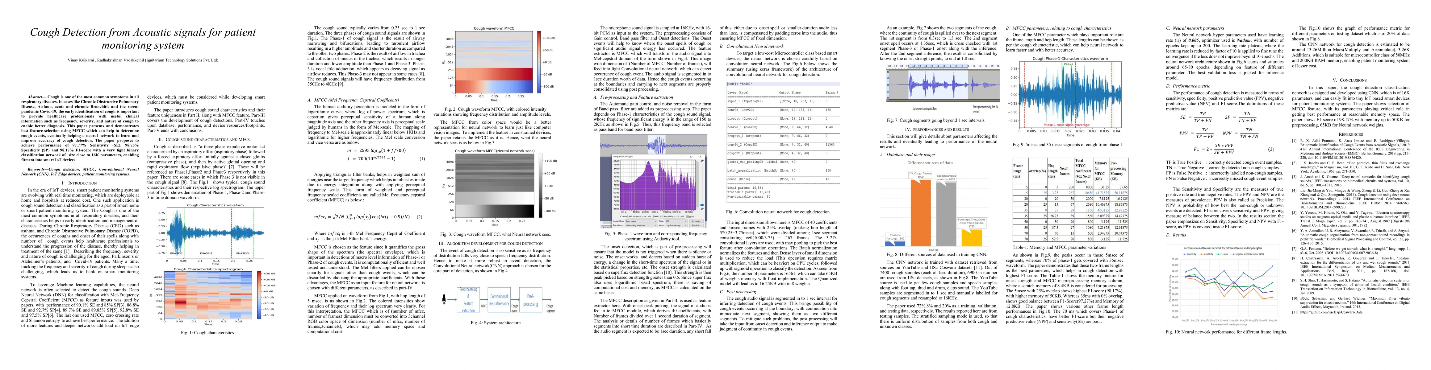 Cough is one of the most common symptoms in all respiratory diseases. In cases like Chronic Obstructive Pulmonary Disease, Asthma, acute and chronic Bronchitis and the recent pandemic Covid-19, the early identification of cough is important to provide healthcare professionals with useful clinical information such as frequency, severity, and nature of cough to enable better diagnosis. This paper presents and demonstrates best feature selection using MFCC which can help to determine cough events, eventually helping a neural network to learn and improve accuracy of cough detection. The paper proposes to achieve performance of 97.77% Sensitivity (SE), 98.75% Specificity (SP) and 98.17% F1-score with a very light binary classification network of size close to 16K parameters, enabling fitment into smart IoT devices.