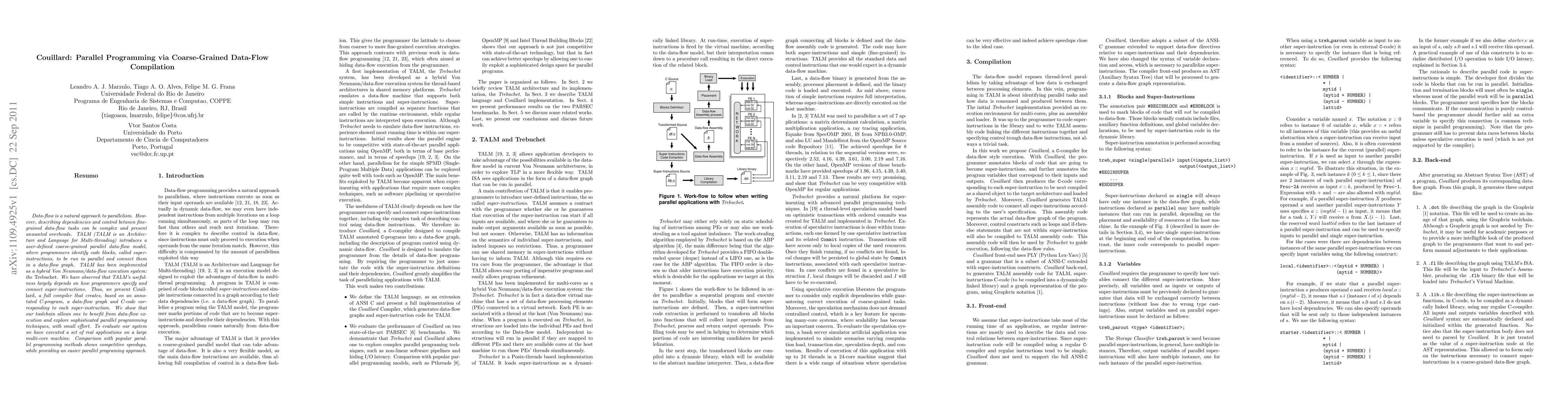 Couillard is a compiler for TALM, a coarse-grained parallel data-flow model, that translates annotated C programs into data-flow graphs and corresponding C-code for super-instructions. It enables efficient parallel programming with competitive speedups compared to popular parallel methods.