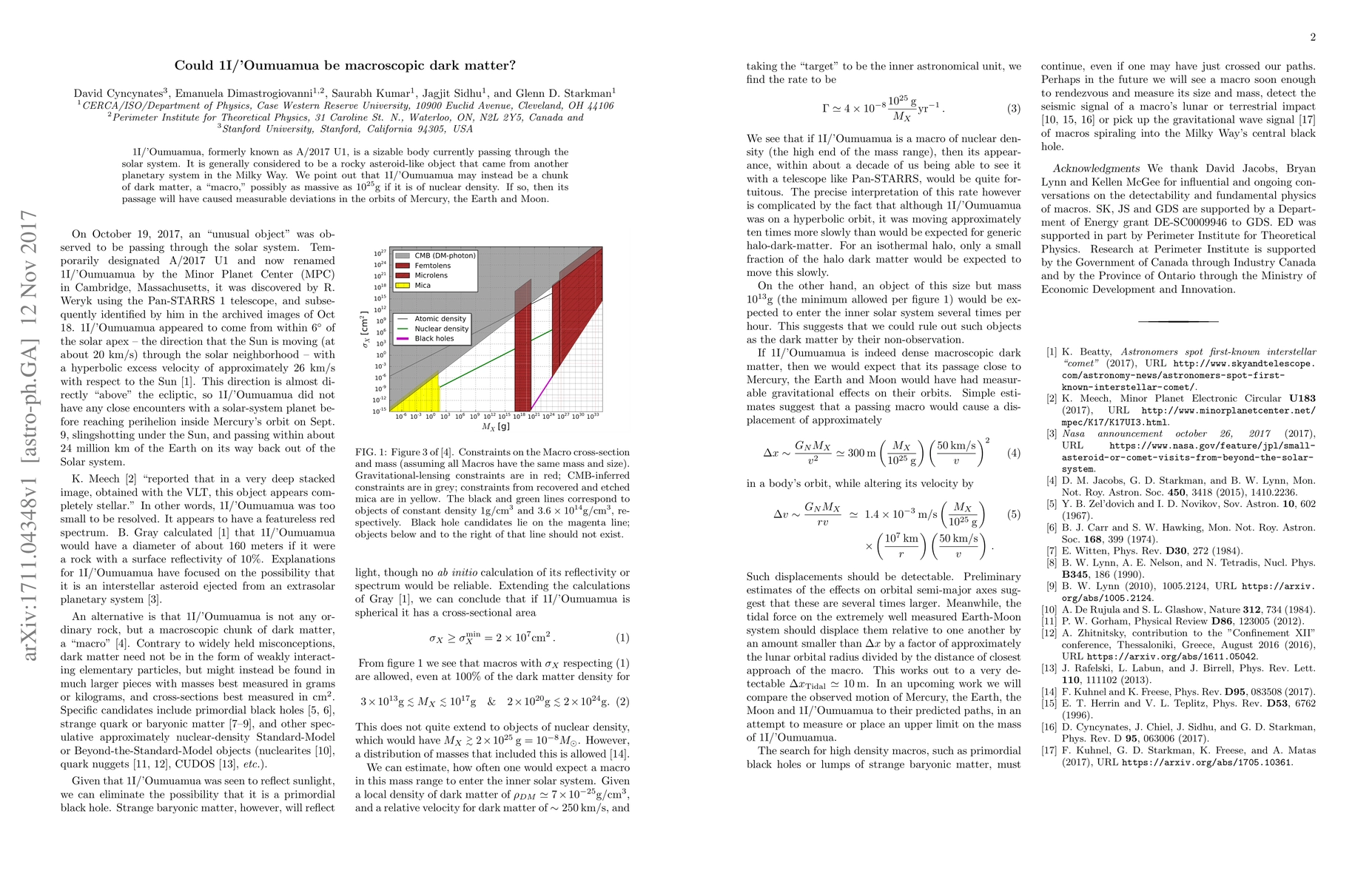 This paper explores the possibility that 1I/'Oumuamua, a passing interstellar object, could be a macroscopic dark matter particle, or "macro," with a mass up to $10^{25}$g. If true, its gravitational influence might have caused detectable changes in the orbits of Mercury, Earth, and the Moon.
