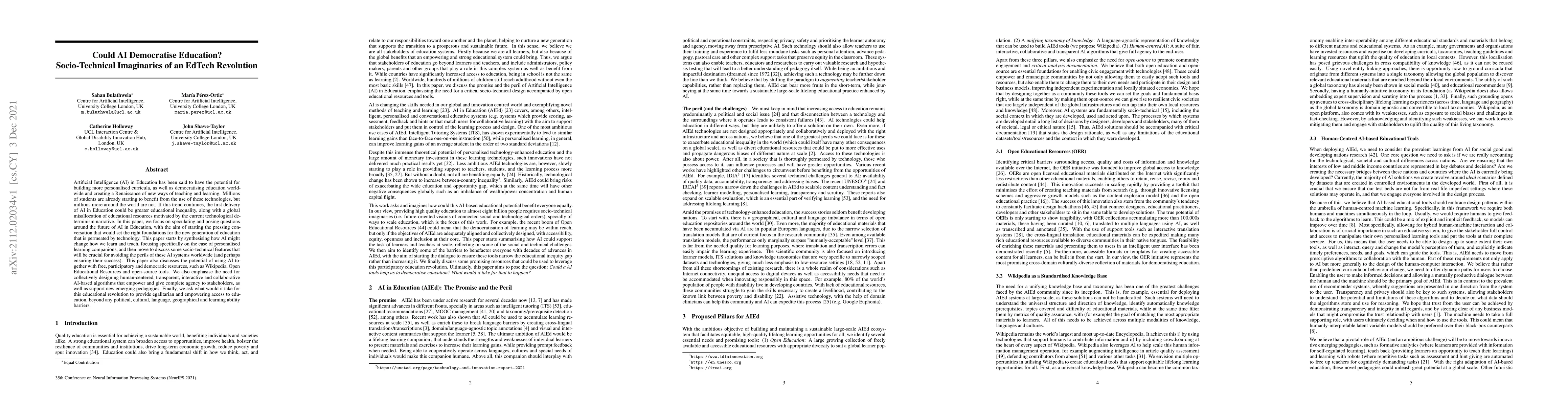 This paper explores the potential of AI to democratise education through personalised learning and the creation of new teaching methods, while cautioning against the risk of increased inequality if not properly managed. It advocates for the collective design of transparent, interactive AI systems that support open educational resources and empower stakeholders, aiming for an egalitarian educational revolution.