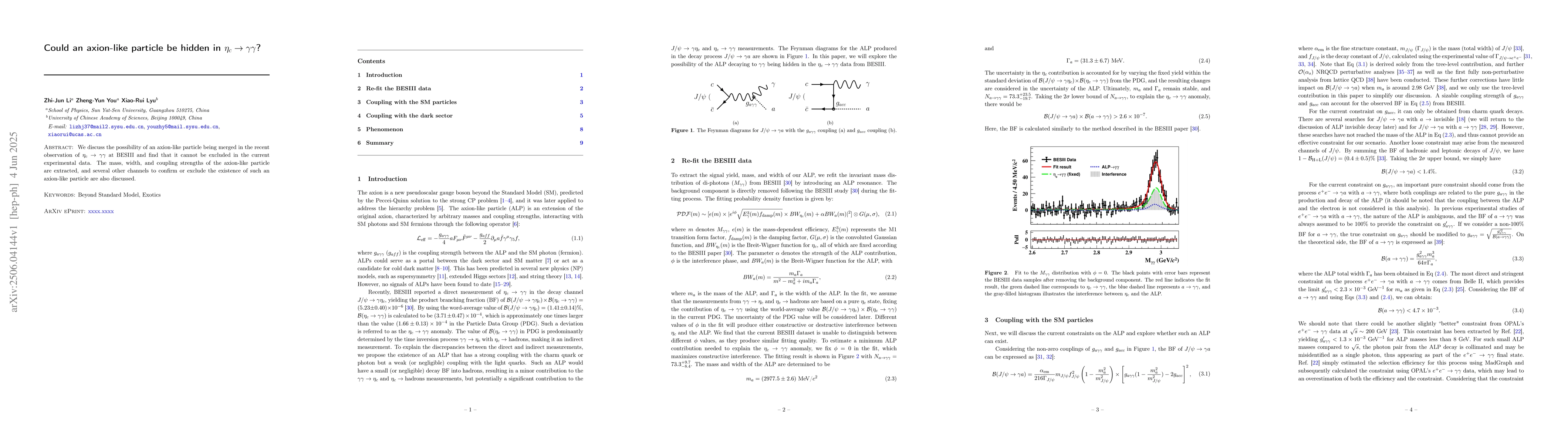 We discuss the possibility of an axion-like particle being merged in the recent observation of $\eta_c \to \gamma\gamma$ at BESIII and find that it cannot be excluded in the current experimental data. The mass, width, and coupling strengths of the axion-like particle are extracted, and several other channels to confirm or exclude the existence of such an axion-like particle are also discussed.