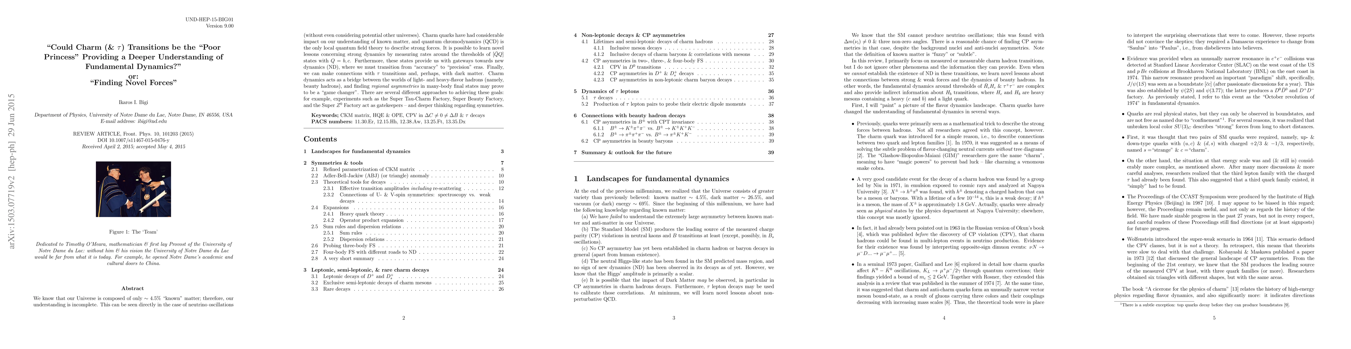 We know that `our' Universe consists of `known' matter only $\sim$ 4.5\%: our understanding is incomplete seeing directly in neutrino oscillations (never mind about `other' Universes). Charm quarks had great impact on our understanding of known matter. QCD is the only local quantum field theory to describe strong forces. We can learn novel lessons about strong dynamics by measuring rates around the thresholds of $[\bar Q Q]$ states with $Q = b, c$. Furthermore they give us gateways for New Dynamics (ND), where we have to go from `accuracy' to `precision' eras. Finally we can connect with $\tau$ transitions and -- maybe -- with dark matter. Charm dynamics acts as a bridge between the worlds of light flavor hadrons with the heavy one, namely beauty hadrons. Finding {\em regional asymmetries} in many-body final states could be a `game changer'. There are several different `roads' to get closer to our goals: experiments act as gatekeepers like Super-tau-charm-factories, Super-beauty-factories and/or Super-$Z^0$-factories -- and deeper thinking about symmetries.