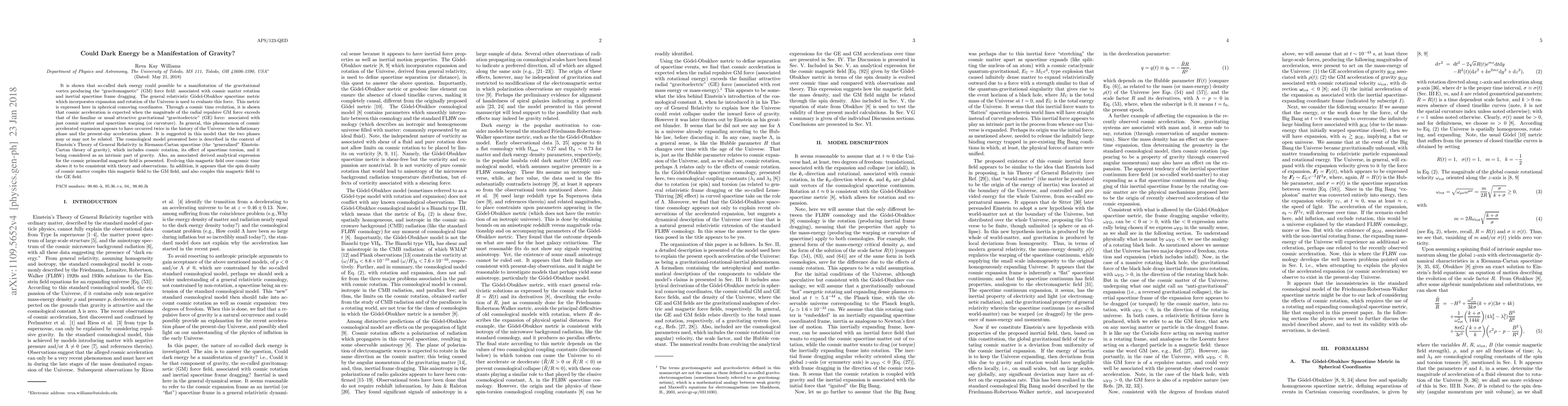 It is shown that so-called dark energy could possible be a manifestation of the gravitational vortex producing the "gravitomagnetic" (GM) force field: associated with cosmic matter rotation and inertial spacetime frame dragging. The general relativistic Godel-Obukhov spacetime metric which incorporates expansion and rotation of the Universe is used to evaluate this force. This metric is expressed here in spherical comoving coordinates. Through a cosmic time evolution, it is shown that cosmic acceleration is expected when the magnitude of the radial repulsive GM force exceeds that of the familiar or usual attractive gravitational "gravitoelectric" (GE) force: associated with just cosmic matter and spacetime warping (or curvature). In general, this phenomenon of cosmic accelerated expansion appears to have occurred twice in the history of the Universe: the inflationary phase and the present-day acceleration phase. It is suggested in this model that the two phases may or may not be related. The cosmological model presented here is described in the context of Einstein's Theory of General Relativity in Riemann-Cartan spacetime (the "generalized" Einstein- Cartan theory of gravity), which includes cosmic rotation, its effect of spacetime torsion, and it being considered as an intrinsic part of gravity. Also, an associated derived analytical expression for the cosmic primordial magnetic field is presented. Evolving this magnetic field over cosmic time shows it to be consistent with theory and observations. In addition, it appears that the spin density of cosmic matter couples this magnetic field to the GM field, and also couples this magnetic field to the GE field.