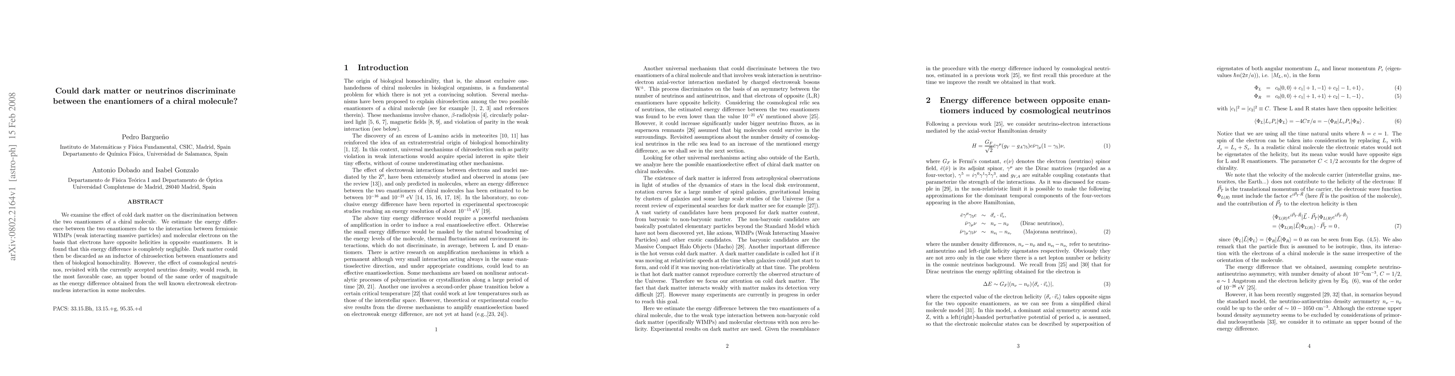 We examine the effect of cold dark matter on the discrimination between the two enantiomers of a chiral molecule. We estimate the energy difference between the two enantiomers due to the interaction between fermionic WIMPs (weak interacting massive particles) and molecular electrons on the basis that electrons have opposite helicities in opposite enantiomers. It is found that this energy difference is completely negligible. Dark matter could then be discarded as an inductor of chiroselection between enantiomers and then of biological homochirality. However, the effect of cosmological neutrinos, revisited with the currently accepted neutrino density, would reach, in the most favorable case, an upper bound of the same order of magnitude as the energy difference obtained from the well known electroweak electron-nucleus interaction in some molecules.