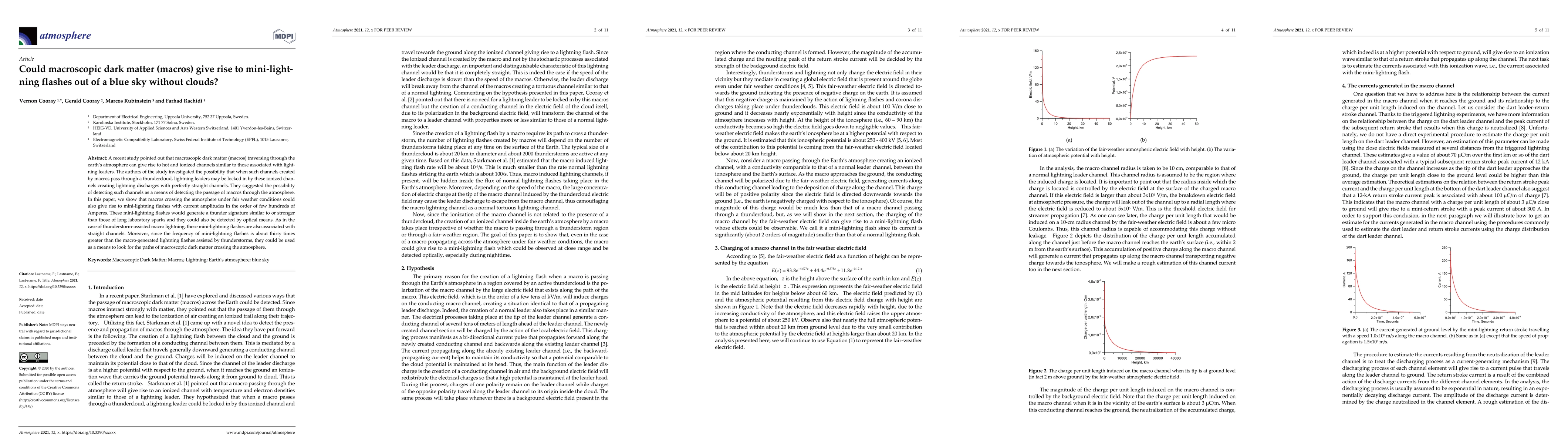 A recent study pointed out that macroscopic dark matter (macros) traversing through the earth's atmosphere can give rise to hot and ionized channels similar to those associated with lightning leaders. The authors of the study investigated the possibility that when such channels created by macros pass through a thundercloud, lightning leaders may locked into these ionized channels creating lightning discharges with perfectly straight channels. They suggested the possibility of detecting such channels as a means of detecting the passage of macros through the atmosphere. In this paper, we show that macros crossing the atmosphere under fair weather conditions could also give rise to mini lightning flashes with current amplitudes in the order of few hundreds of Amperes. These mini lightning flashes would generate a thunder signature similar to or stronger than those of long laboratory sparks and they could also be detected by optical means. As in the case of thunderstorm assisted macro lightning, these mini-lightning flashes are also associated with straight channels. Moreover, since the frequency of mini lightning flashes are about three hundred times more frequent than the macro generated lightning flashes which were assisted by thunderstorms, they could be used as a means to look for the paths of macroscopic dark matter crossing the atmosphere.