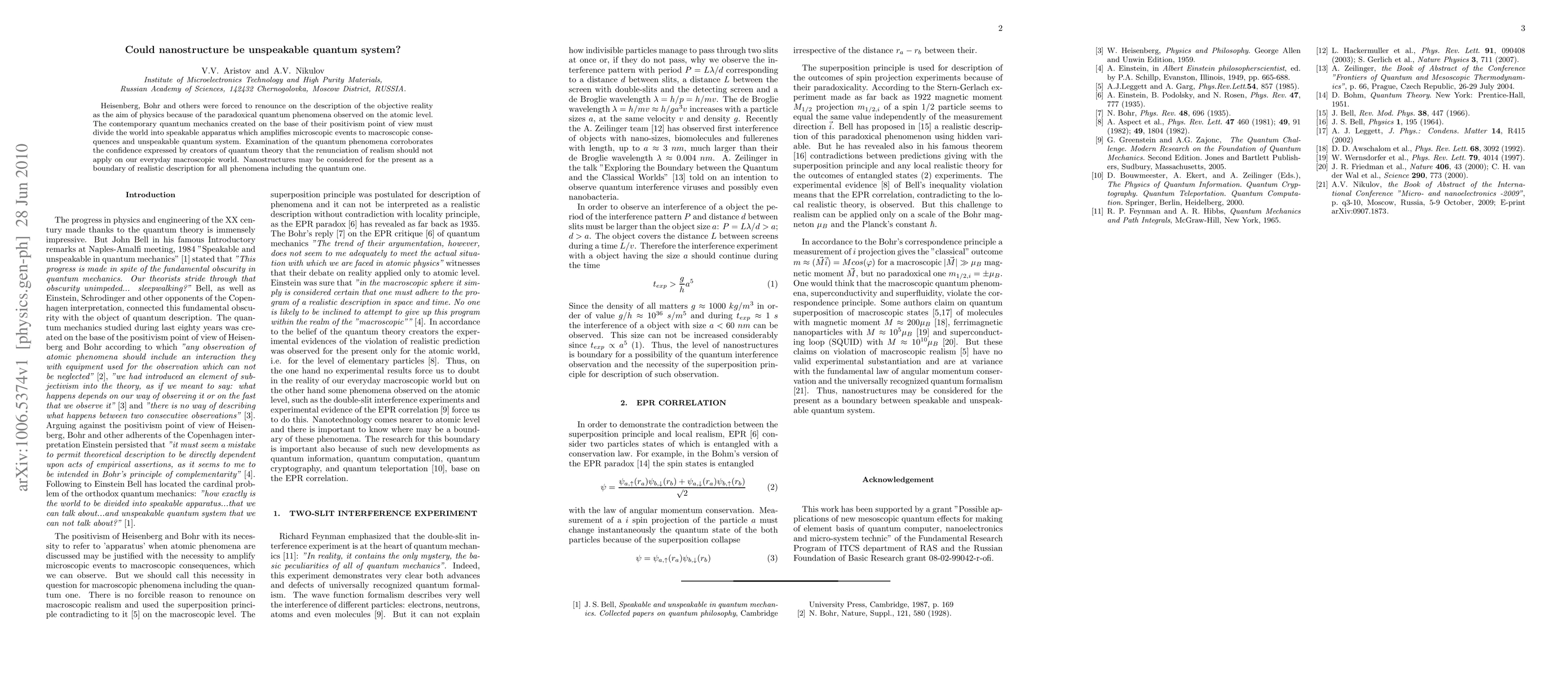 Heisenberg, Bohr and others were forced to renounce on the description of the objective reality as the aim of physics because of the paradoxical quantum phenomena observed on the atomic level. The contemporary quantum mechanics created on the base of their positivism point of view must divide the world into speakable apparatus which amplifies microscopic events to macroscopic consequences and unspeakable quantum system. Examination of the quantum phenomena corroborates the confidence expressed by creators of quantum theory that the renunciation of realism should not apply on our everyday macroscopic world. Nanostructures may be considered for the present as a boundary of realistic description for all phenomena including the quantum one.