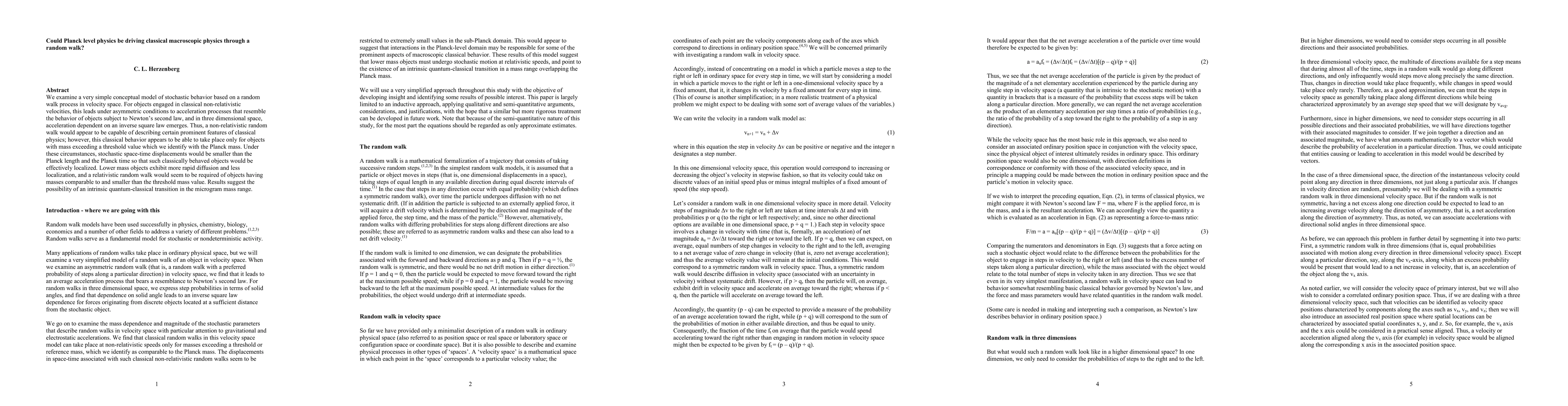 We examine a very simple conceptual model of stochastic behavior based on a random walk process in velocity space. For objects engaged in classical non-relativistic velocities, this leads under asymmetric conditions to acceleration processes that resemble the behavior of objects subject to Newton's second law, and in three dimensional space, acceleration dependent on an inverse square law emerges. Thus, a non-relativistic random walk would appear to be capable of describing certain prominent features of classical physics; however, this classical behavior appears to be able to take place only for objects with mass exceeding a threshold value which we identify with the Planck mass. Under these circumstances, stochastic space-time displacements would be smaller than the Planck length and the Planck time so that such classically behaved objects would be effectively localized. Lower mass objects exhibit more rapid diffusion and less localization, and a relativistic random walk would seem to be required of objects having masses comparable to and smaller than the threshold mass value. Results suggest the possibility of an intrinsic quantum-classical transition in the microgram mass range.