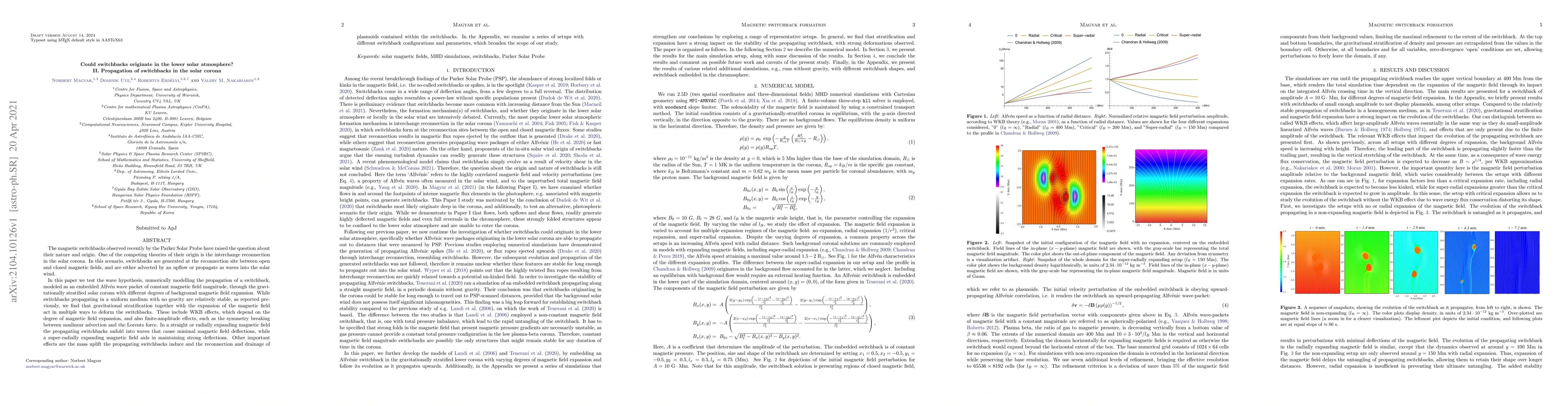 This paper investigates the propagation of magnetic switchbacks in the solar corona, proposing that they may originate from the lower solar atmosphere. Numerical simulations reveal that gravitational stratification and magnetic field expansion significantly deform switchbacks, with super-radial expansion aiding in maintaining strong magnetic field deflections, while also inducing mass uplift and plasmoid reconnection.