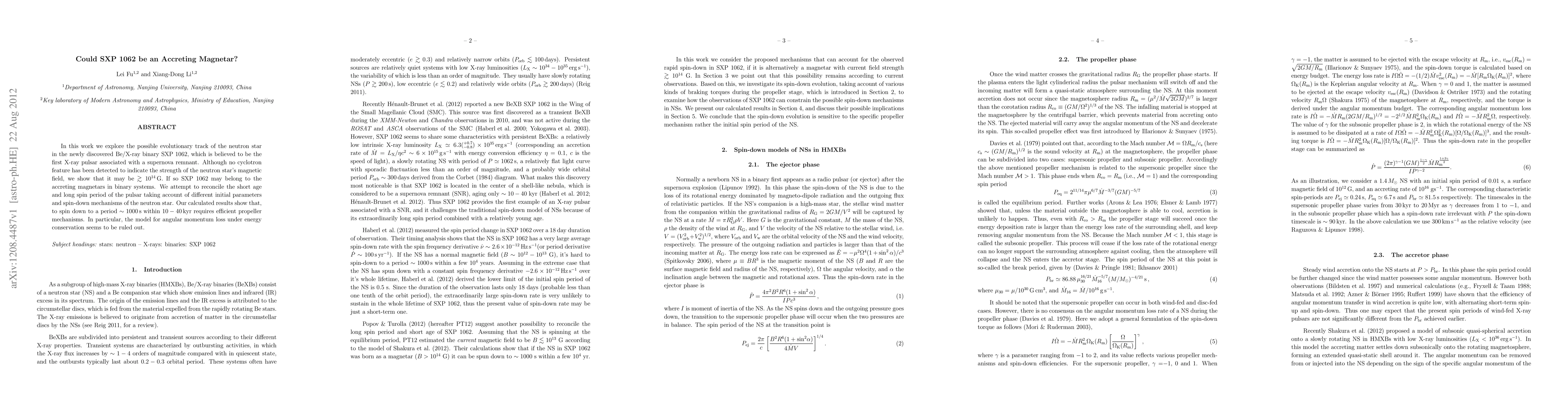 In this work we explore the possible evolutionary track of the neutron star in the newly discovered Be/X-ray binary SXP 1062, which is believed to be the first X-ray pulsar associated with a supernova remnant. Although no cyclotron feature has been detected to indicate the strength of the neutron star's magnetic field, we show that it may be $\ga 10^{14} $G. If so SXP 1062 may belong to the accreting magnetars in binary systems. We attempt to reconcile the short age and long spin period of the pulsar taking account of different initial parameters and spin-down mechanisms of the neutron star. Our calculated results show that, to spin down to a period $\sim 1000 $s within $10-40 $kyr requires efficient propeller mechanisms. In particular, the model for angular momentum loss under energy conservation seems to be ruled out.