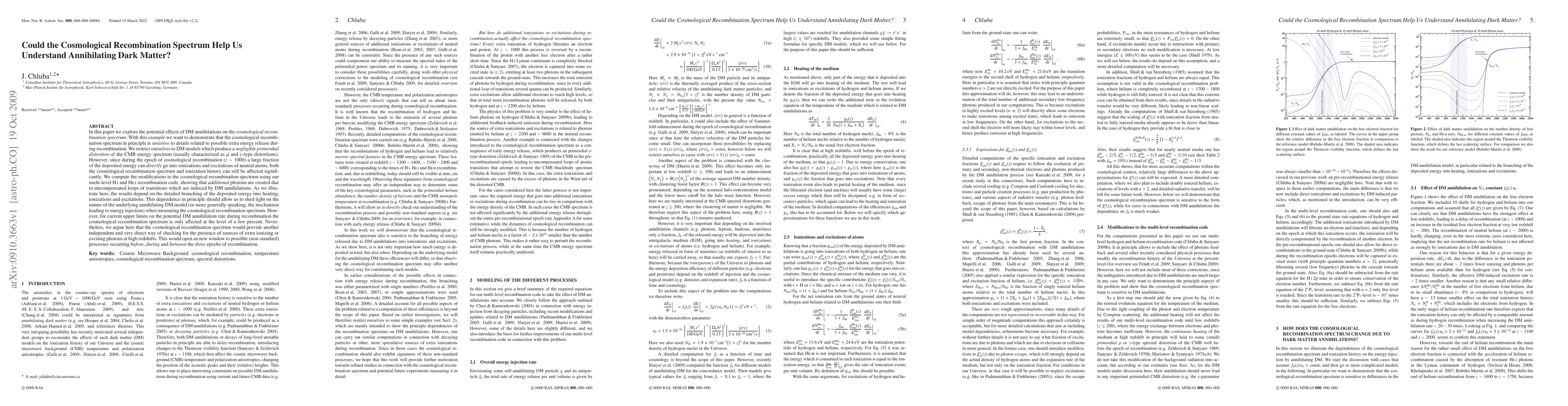 This paper investigates how dark matter (DM) annihilations during cosmological recombination could affect the recombination spectrum, demonstrating that the spectrum could reveal details of energy release during this epoch. While current DM annihilation rates cause only minor changes, the spectrum's sensitivity to energy distribution could provide insights into DM models and high-redshift extra ionizing sources.