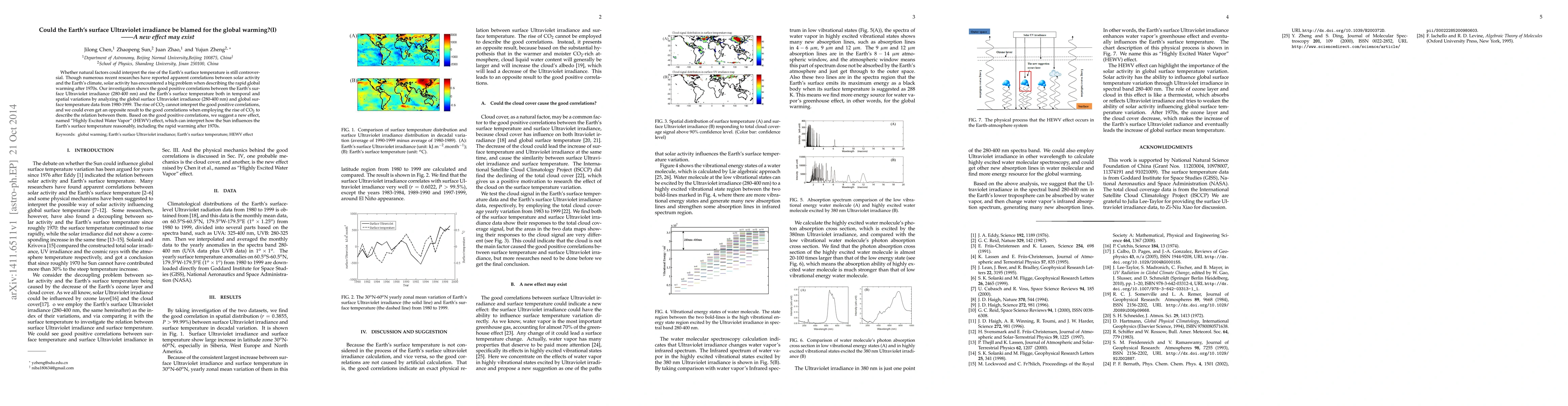 This paper investigates correlations between Earth's surface Ultraviolet irradiance and surface temperature, suggesting a new "Highly Excited Water Vapor" (HEWV) effect to explain the rapid global warming post-1970s, as traditional solar activity explanations fall short. The study finds strong positive correlations between Ultraviolet irradiance and temperature, independent of CO$_2$ rise.