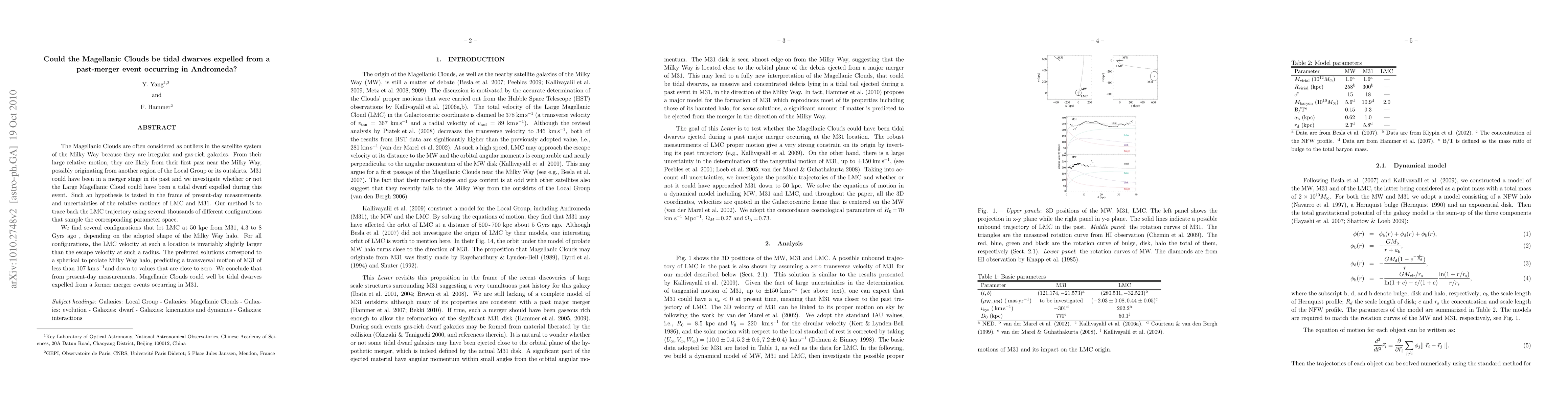 The Magellanic Clouds are often considered as outliers in the satellite system of the Milky Way because they are irregular and gas-rich galaxies. From their large relative motion, they are likely from their first pass near the Milky Way, possibly originating from another region of the Local Group or its outskirts. M31 could have been in a merger stage in its past and we investigate whether or not the Large Magellanic Cloud could have been a tidal dwarf expelled during this event. Such an hypothesis is tested in the frame of present-day measurements and uncertainties of the relative motions of LMC and M31. Our method is to trace back the LMC trajectory using several thousands of different configurations that sample the corresponding parameter space. We find several configurations that let LMC at 50 kpc from M31, 4.3 to 8 Gyrs ago, depending on the adopted shape of the Milky Way halo. For all configurations, the LMC velocity at such a location is invariably slightly larger than the escape velocity at such a radius. The preferred solutions correspond to a spherical to prolate Milky Way halo, predicting a transversal motion of M31 of less than 107 km/s and down to values that are close to zero. We conclude that from present-day measurements, Magellanic Clouds could well be tidal dwarves expelled from a former merger events occurring in M31.