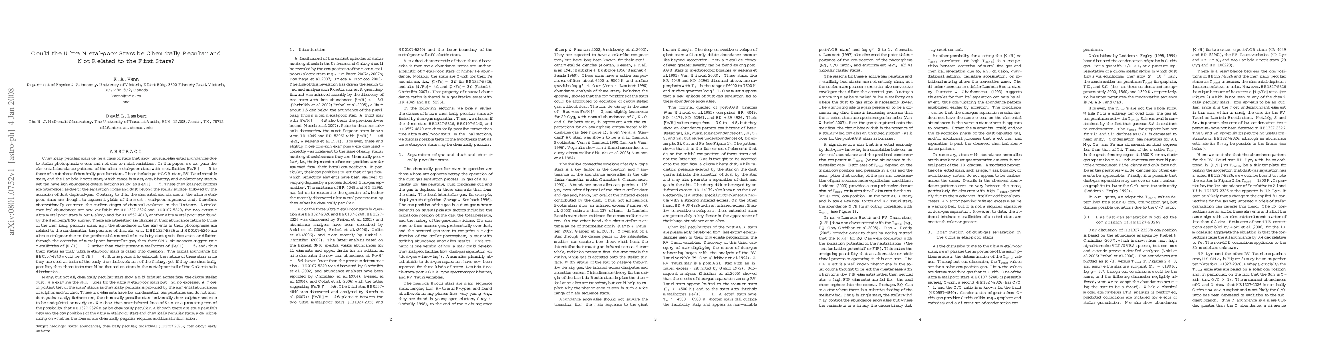 This paper investigates whether ultra metal-poor stars, traditionally thought to be remnants from the first stars, could instead exhibit chemically peculiar abundance patterns similar to post-AGB, RV Tauri, and Lambda Bootis stars. The study finds that while chemically peculiar stars show unusual elemental abundances due to surface processes, ultra metal-poor stars' abundances likely reflect early supernova yields, suggesting they may not be directly related to the first stars.
