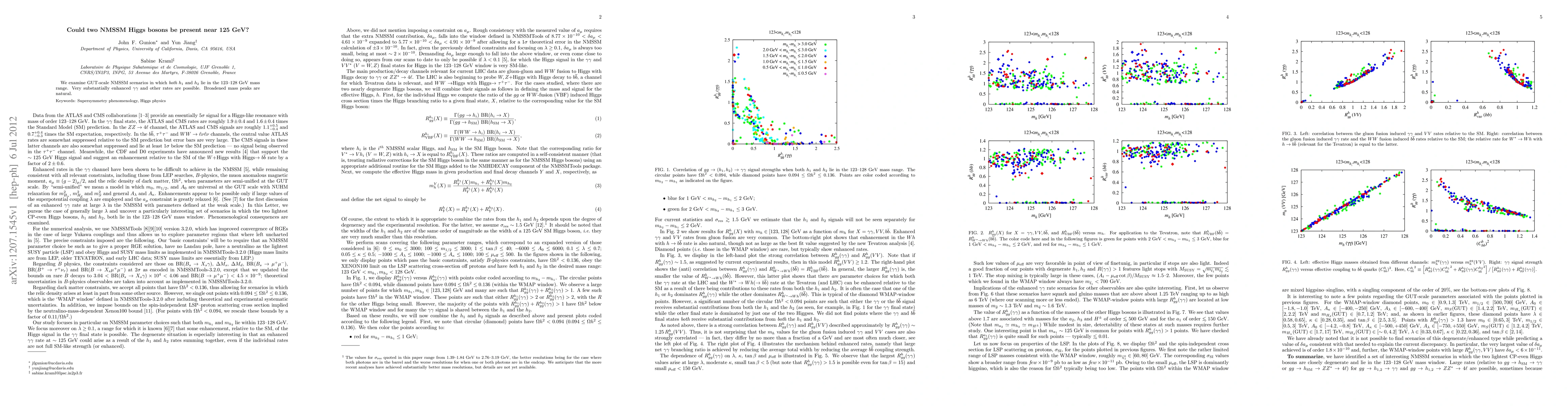 The paper explores NMSSM scenarios where two Higgs bosons, h1 and h2, both reside near 125 GeV, potentially explaining observed enhanced gamma-gamma rates. Broadened mass peaks are considered natural in these GUT-scale models.
