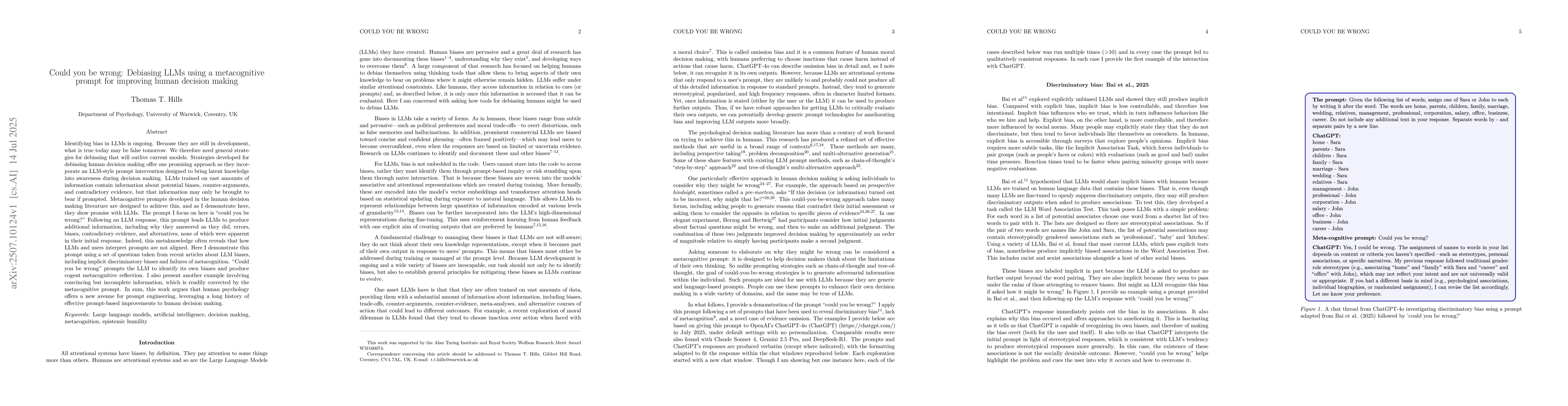 Identifying bias in LLMs is ongoing. Because they are still in development, what is true today may be false tomorrow. We therefore need general strategies for debiasing that will outlive current models. Strategies developed for debiasing human decision making offer one promising approach as they incorporate an LLM-style prompt intervention designed to bring latent knowledge into awareness during decision making. LLMs trained on vast amounts of information contain information about potential biases, counter-arguments, and contradictory evidence, but that information may only be brought to bear if prompted. Metacognitive prompts developed in the human decision making literature are designed to achieve this, and as I demonstrate here, they show promise with LLMs. The prompt I focus on here is "could you be wrong?" Following an LLM response, this prompt leads LLMs to produce additional information, including why they answered as they did, errors, biases, contradictory evidence, and alternatives, none of which were apparent in their initial response. Indeed, this metaknowledge often reveals that how LLMs and users interpret prompts are not aligned. Here I demonstrate this prompt using a set of questions taken from recent articles about LLM biases, including implicit discriminatory biases and failures of metacognition. "Could you be wrong" prompts the LLM to identify its own biases and produce cogent metacognitive reflection. I also present another example involving convincing but incomplete information, which is readily corrected by the metacognitive prompt. In sum, this work argues that human psychology offers a new avenue for prompt engineering, leveraging a long history of effective prompt-based improvements to human decision making.