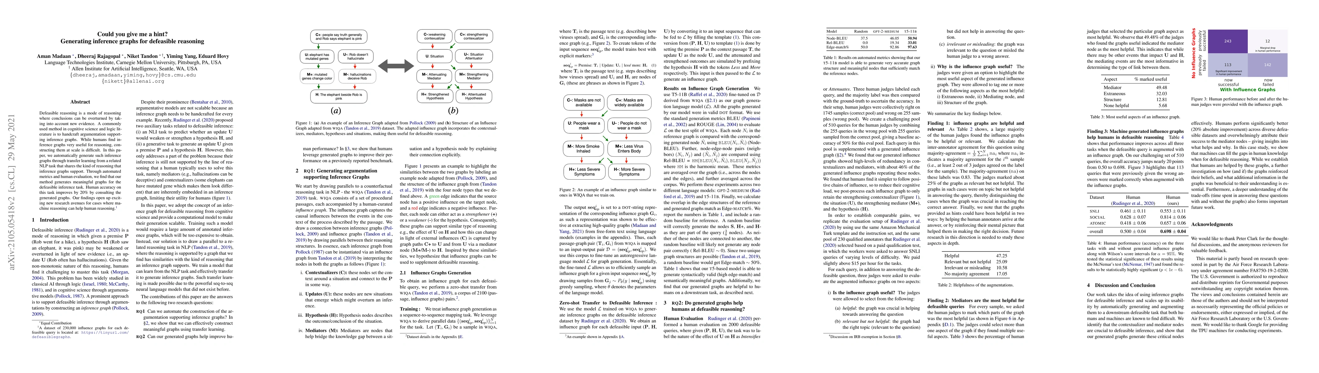 Defeasible reasoning is the mode of reasoning where conclusions can be overturned by taking into account new evidence. A commonly used method in cognitive science and logic literature is to handcraft argumentation supporting inference graphs. While humans find inference graphs very useful for reasoning, constructing them at scale is difficult. In this paper, we automatically generate such inference graphs through transfer learning from another NLP task that shares the kind of reasoning that inference graphs support. Through automated metrics and human evaluation, we find that our method generates meaningful graphs for the defeasible inference task. Human accuracy on this task improves by 20% by consulting the generated graphs. Our findings open up exciting new research avenues for cases where machine reasoning can help human reasoning. (A dataset of 230,000 influence graphs for each defeasible query is located at: https://tinyurl.com/defeasiblegraphs.)