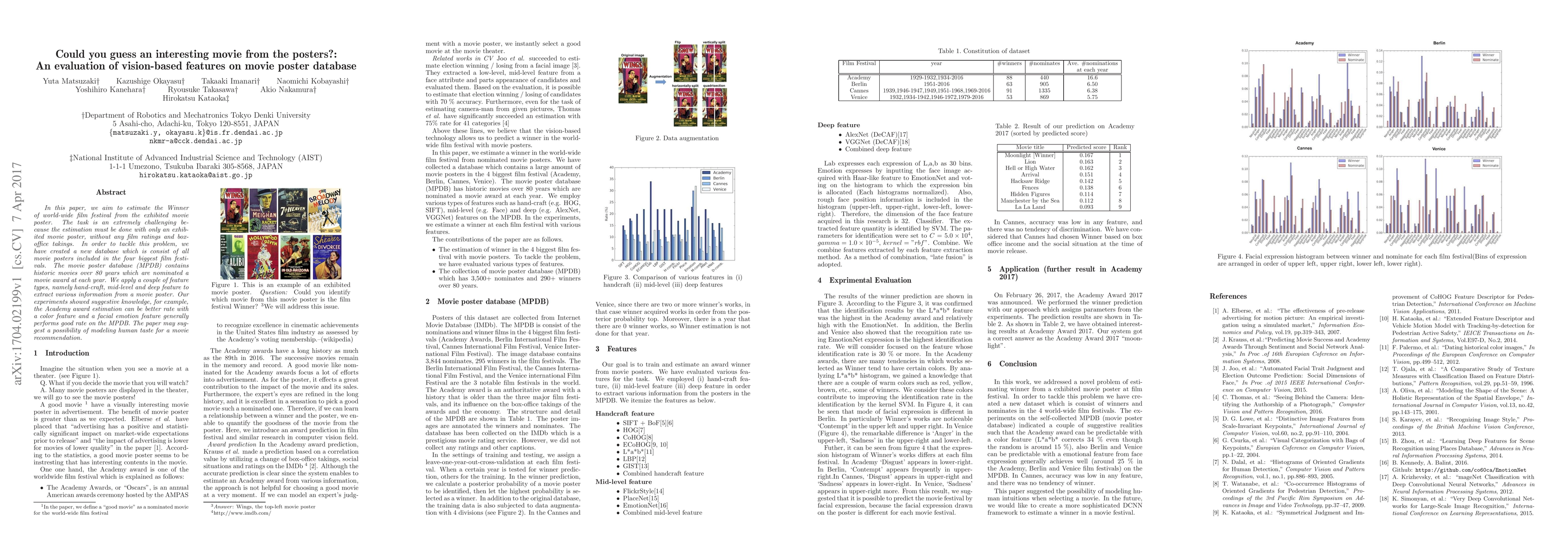 In this paper, we aim to estimate the Winner of world-wide film festival from the exhibited movie poster. The task is an extremely challenging because the estimation must be done with only an exhibited movie poster, without any film ratings and box-office takings. In order to tackle this problem, we have created a new database which is consist of all movie posters included in the four biggest film festivals. The movie poster database (MPDB) contains historic movies over 80 years which are nominated a movie award at each year. We apply a couple of feature types, namely hand-craft, mid-level and deep feature to extract various information from a movie poster. Our experiments showed suggestive knowledge, for example, the Academy award estimation can be better rate with a color feature and a facial emotion feature generally performs good rate on the MPDB. The paper may suggest a possibility of modeling human taste for a movie recommendation.