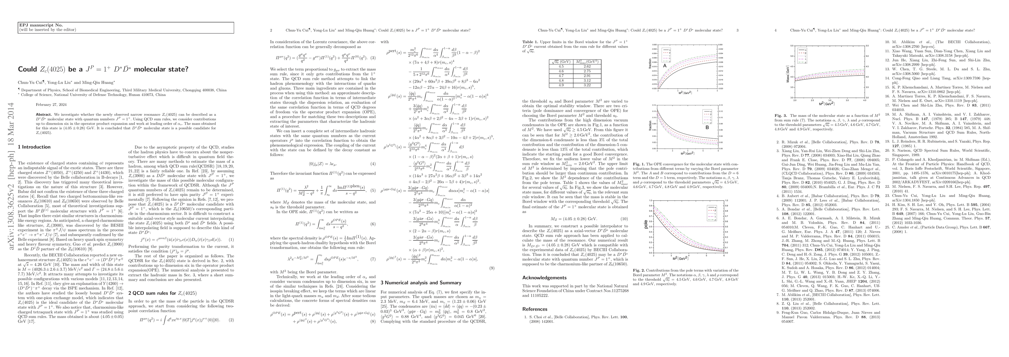 We investigate whether the newly observed narrow resonance $Z_{c}(4025)$ can be described as a $D^{*}\bar{D^{*}}$ molecular state with quantum numbers $J^{P}=1^{+}$. Using QCD sum rules, we consider contributions up to dimension six in the operator product expansion and work at leading order of $\alpha_{s}$. The mass obtained for this state is $(4.05\pm 0.28) \mbox{GeV}$. It is concluded that $D^{*}\bar{D^{*}}$ molecular state is a possible candidate for $Z_{c}(4025)$.