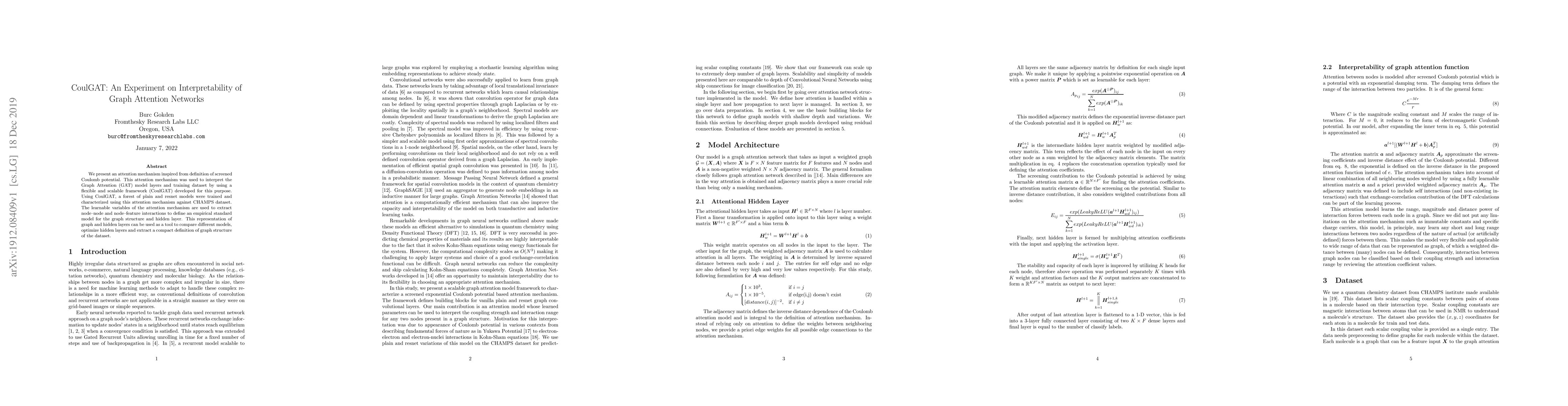We present an attention mechanism inspired from definition of screened Coulomb potential. This attention mechanism was used to interpret the Graph Attention (GAT) model layers and training dataset by using a flexible and scalable framework (CoulGAT) developed for this purpose. Using CoulGAT, a forest of plain and resnet models were trained and characterized using this attention mechanism against CHAMPS dataset. The learnable variables of the attention mechanism are used to extract node-node and node-feature interactions to define an empirical standard model for the graph structure and hidden layer. This representation of graph and hidden layers can be used as a tool to compare different models, optimize hidden layers and extract a compact definition of graph structure of the dataset.
