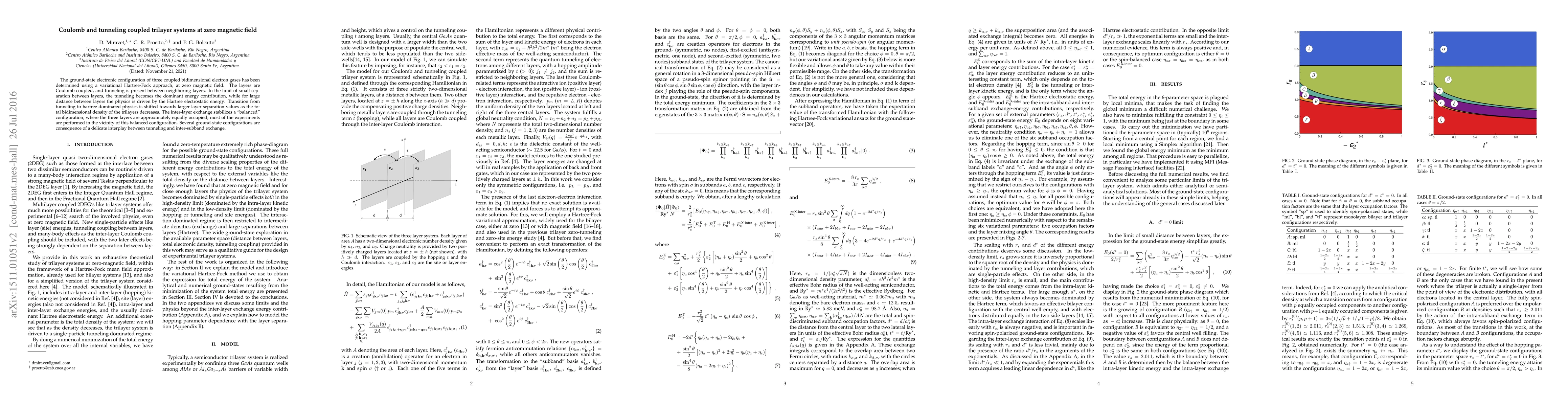 The ground-state electronic configuration of three coupled bidimensional electron gases has been determined using a variational Hartree-Fock approach, at zero magnetic field. The layers are Coulomb coupled, and tunneling is present between neighboring layers. In the limit of small separation between layers, the tunneling becomes the dominant energy contribution, while for large distance between layers the physics is driven by the Hartree electrostatic energy. Transition from tunneling to hartree dominated physics is shifted towards larger layer separation values as the total bidimensional density of the trilayers decreases. The inter-layer exchange helps in stabilize a "balanced" configuration, where the three layers are approximately equally occupied; most of the experiments are performed in the vicinity of this balanced configuration. Several ground-state configurations are consequence of a delicate interplay between tunneling and inter-subband exchange.