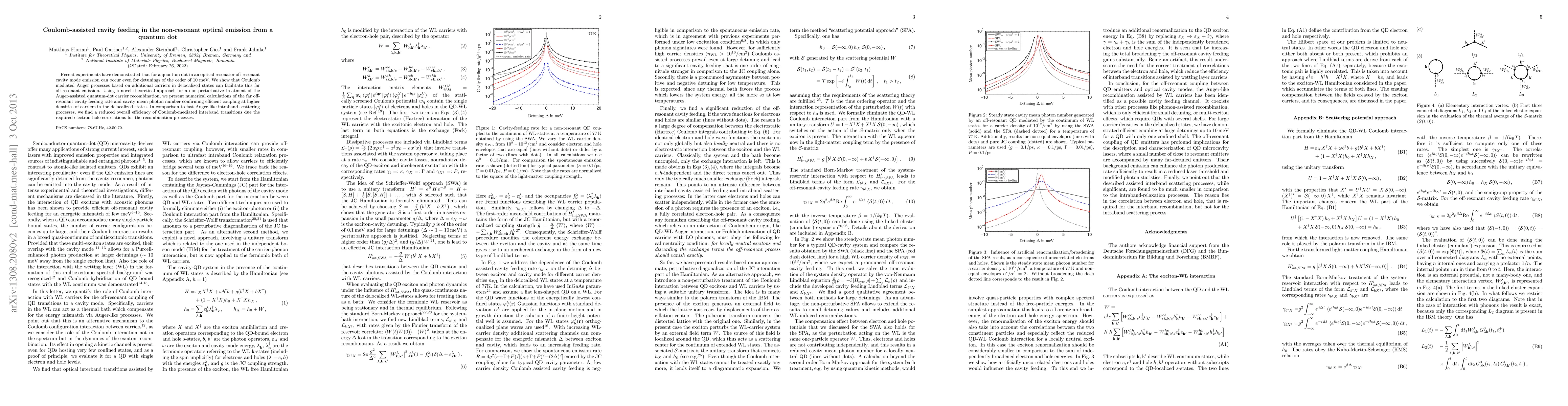 This paper demonstrates Coulomb-mediated Auger processes enable off-resonant optical emission from quantum dots in optical cavities even with significant detunings. Theoretical calculations show efficient cavity coupling at higher carrier densities, though interband transitions are less efficient than intraband processes due to required electron-hole correlations.