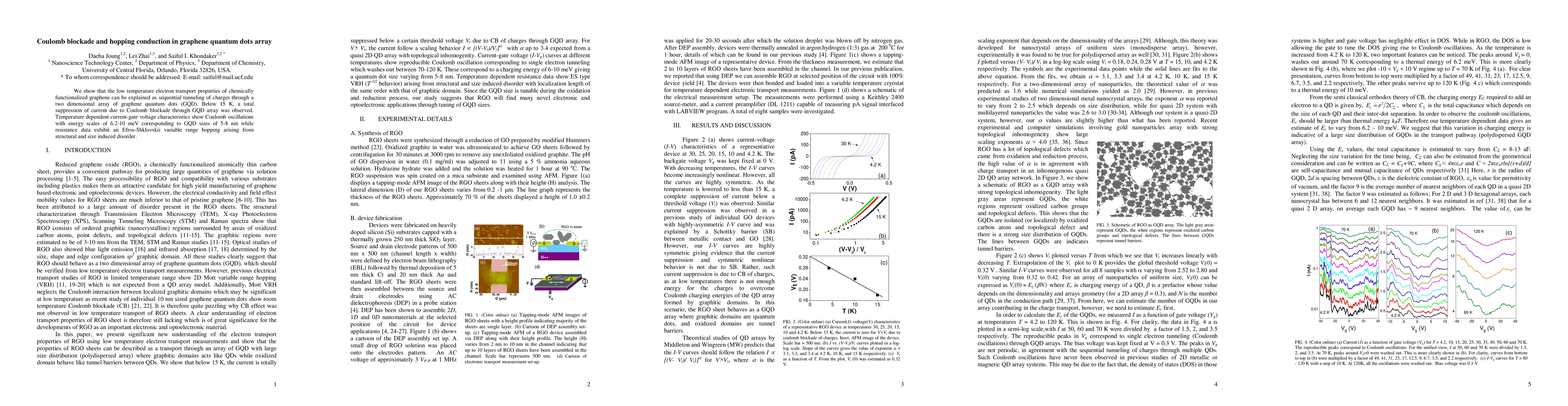 This study demonstrates that electron transport in chemically functionalized graphene at low temperatures is dominated by Coulomb blockade and hopping conduction through a two-dimensional array of graphene quantum dots. Below 15 K, current is completely suppressed due to Coulomb blockade, with observed Coulomb oscillations indicating quantum dot sizes of 5-8 nm.