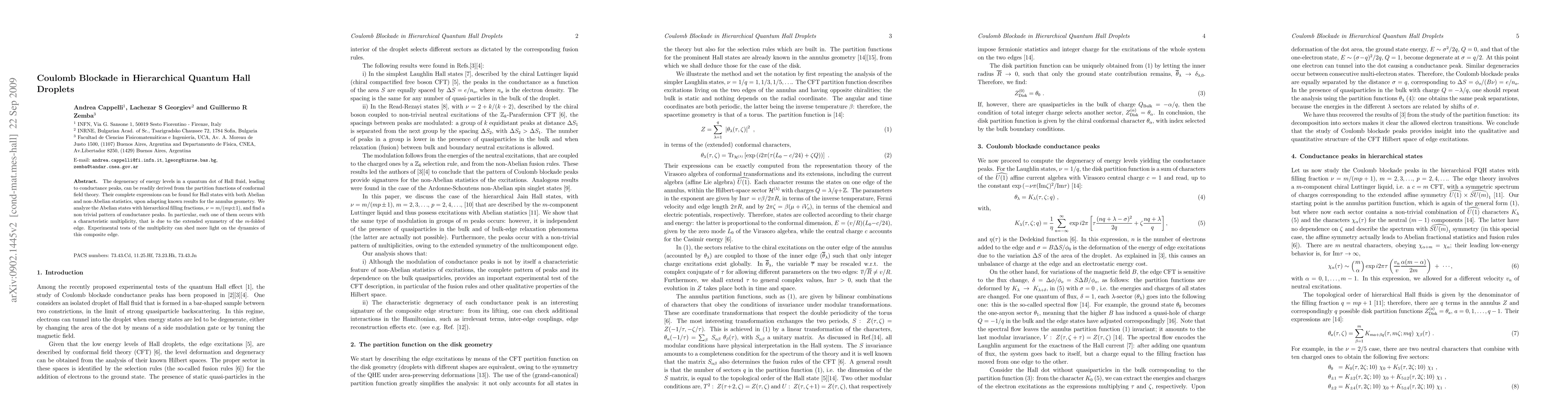 The degeneracy of energy levels in a quantum dot of Hall fluid, leading to conductance peaks, can be readily derived from the partition functions of conformal field theory. Their complete expressions can be found for Hall states with both Abelian and non-Abelian statistics, upon adapting known results for the annulus geometry. We analyze the Abelian states with hierarchical filling fractions, \nu=m/(mp \pm 1), and find a non trivial pattern of conductance peaks. In particular, each one of them occurs with a characteristic multiplicity, that is due to the extended symmetry of the m-folded edge. Experimental tests of the multiplicity can shed more light on the dynamics of this composite edge.