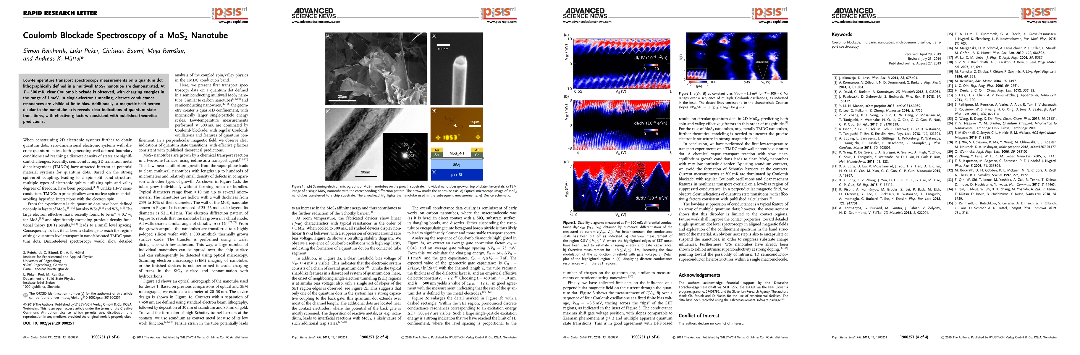 Researchers observed clear Coulomb blockade in a MoS2 nanotube at 300mK, with charging energies around 1meV and discrete conductance resonances visible under single-electron tunneling.