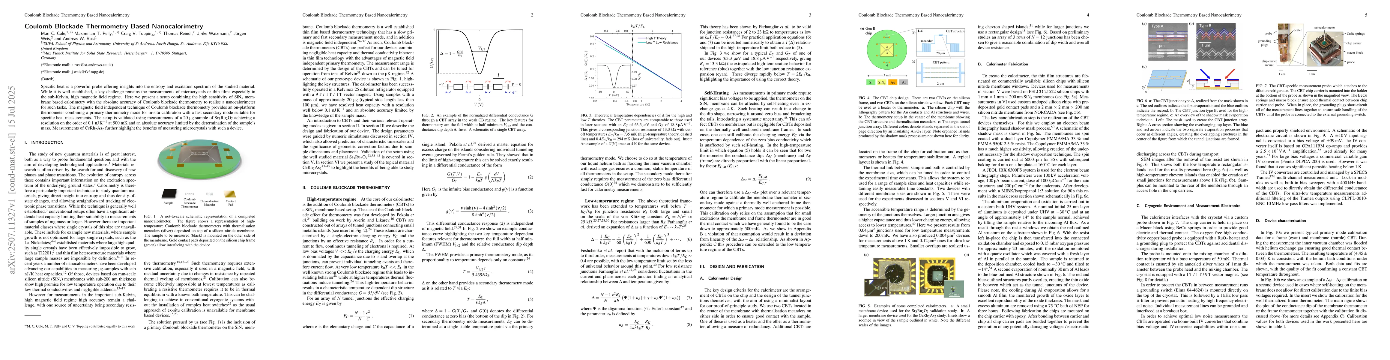 Specific heat is a powerful probe offering insights into the entropy and excitation spectrum of the studied material. While it is well established, a key challenge remains the measurements of microcrystals or thin films especially in the sub-Kelvin, high magnetic field regime. Here we present a setup combining the high sensitivity of SiN$_x$ membrane based calorimetry with the absolute accuracy of Coulomb blockade thermometry to realise a nanocalorimeter for such tasks. The magnetic field independent technique of Coulomb blockade thermometry provides an on-platform thermometer combining a primary thermometry mode for in-situ calibration with a fast secondary mode suitable for specific heat measurements. The setup is validated using measurements of a 20 $\mu$g sample of Sr$_3$Ru$_2$O$_7$ achieving a resolution on the order of 0.1 nJ/K at 500 mK and an absolute accuracy limited by the determination of the sample's mass. Measurements of CeRh$_2$As$_2$ further highlight the benefits of measuring microcrystals with such a device.