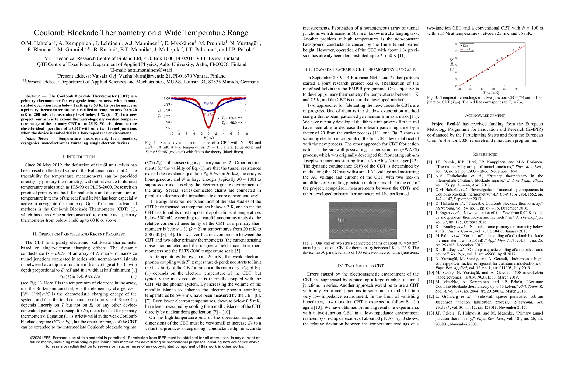 Title: Coulomb Blockade Thermometry on a Wide Temperature Range Summary: This paper explores the performance of Coulomb Blockade Thermometers (CBT) from cryogenic to low temperatures, showing verified operation up to 60 K, with a focus on extending the range to 25 K and demonstrating effective operation with minimal tunnel junctions in a low-impedance setting.