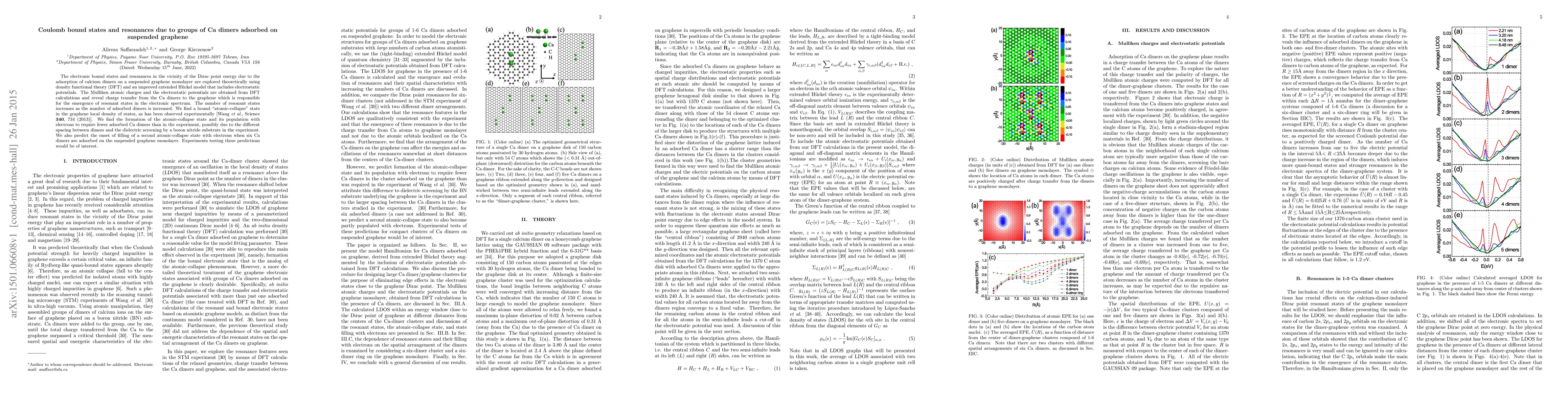 The electronic bound states and resonances in the vicinity of the Dirac point energy due to the adsorption of calcium dimers on a suspended graphene monolayer are explored theoretically using density functional theory (DFT) and an improved extended H\"uckel model that includes electrostatic potentials. The Mulliken atomic charges and the electrostatic potentials are obtained from DFT calculations and reveal charge transfer from the Ca dimers to the graphene which is responsible for the emergence of resonant states in the electronic spectrum. The number of resonant states increases as the number of adsorbed dimers is increased. We find a bound "atomic-collapse" state in the graphene local density of states, as has been observed experimentally [Wang \textit{et al.}, Science {\bf 340}, 734 (2013)]. We find the formation of the atomic-collapse state and its population with electrons to require fewer adsorbed Ca dimers than in the experiment, possibly due to the different spacing between dimers and the dielectric screening by a boron nitride substrate in the experiment. We also predict the onset of filling of a second atomic-collapse state with electrons when six Ca dimers are adsorbed on the suspended graphene monolayer. Experiments testing these predictions would be of interest.
