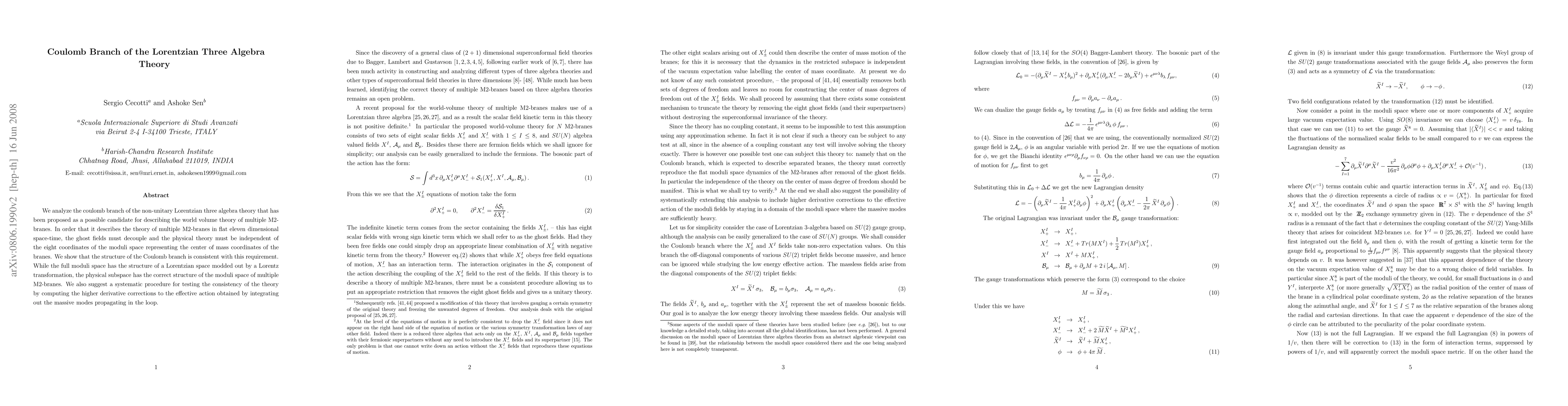 We analyze the coulomb branch of the non-unitary Lorentzian three algebra theory that has been proposed as a possible candidate for describing the world volume theory of multiple M2-branes. In order that it describes the theory of multiple M2-branes in flat eleven dimensional space-time, the ghost fields must decouple and the physical theory must be independent of the eight coordinates of the moduli space representing the center of mass coordinates of the branes. We show that the structure of the Coulomb branch is consistent with this requirement. While the full moduli space has the structure of a Lorentzian space modded out by a Lorentz transformation, the physical subspace has the correct structure of the moduli space of multiple M2-branes. We also suggest a systematic procedure for testing the consistency of the theory by computing the higher derivative corrections to the effective action obtained by integrating out the massive modes propagating in the loop.