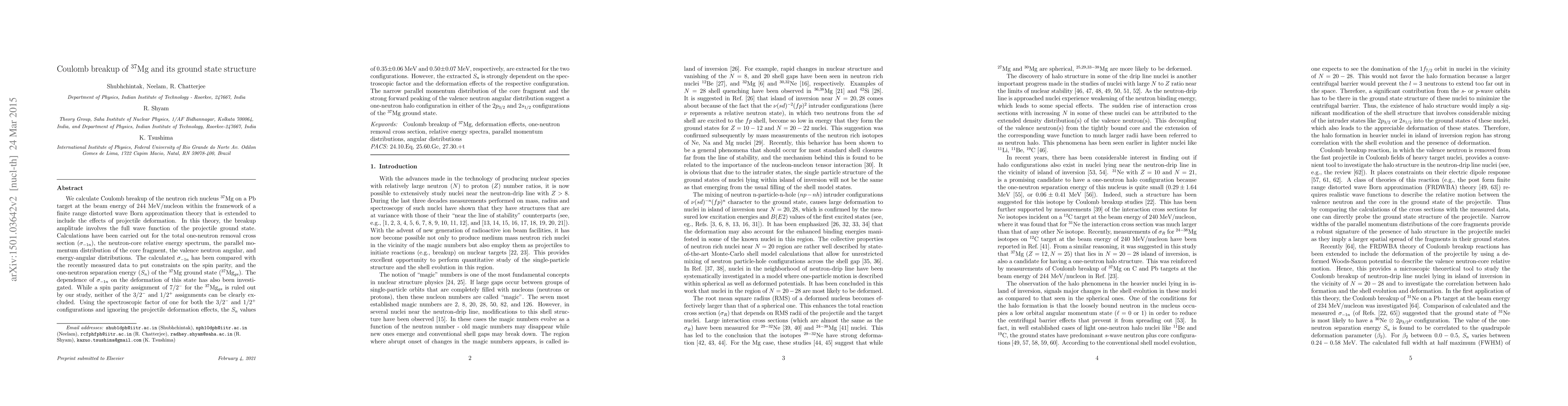 Researchers calculate Coulomb breakup of $^{37}$Mg on a Pb target to study its ground state structure, finding evidence for a one-neutron halo configuration in either the $2p_{3/2}$ or $2s_{1/2}$ configurations.