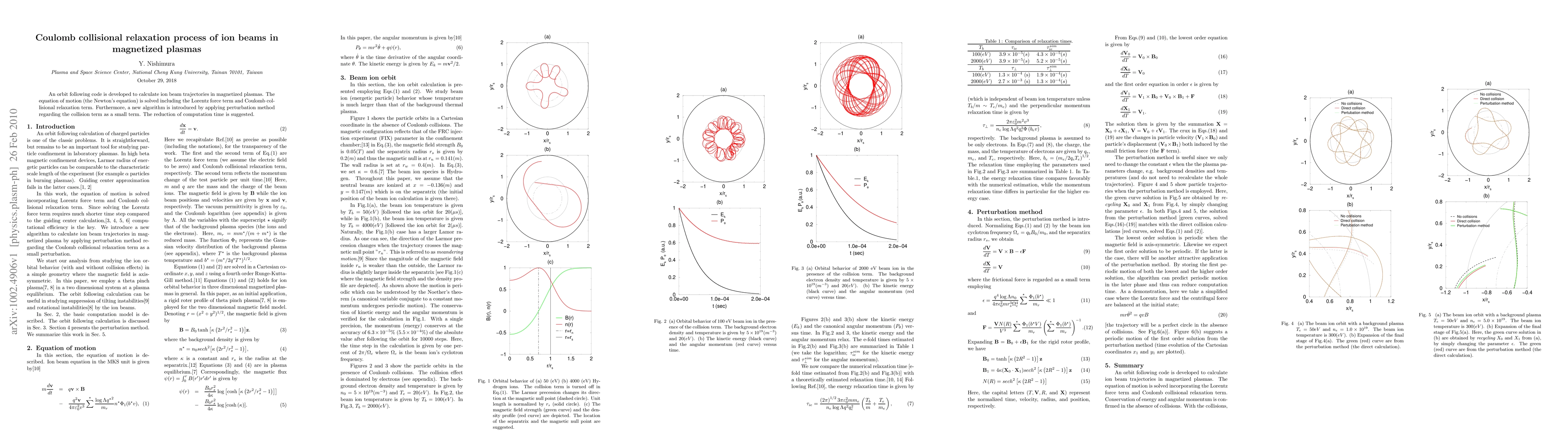 This paper develops a code to track ion beam trajectories in magnetized plasmas, solving the equation of motion with Lorentz and Coulomb collisional relaxation forces. It introduces a new algorithm using perturbation methods to reduce computation time.