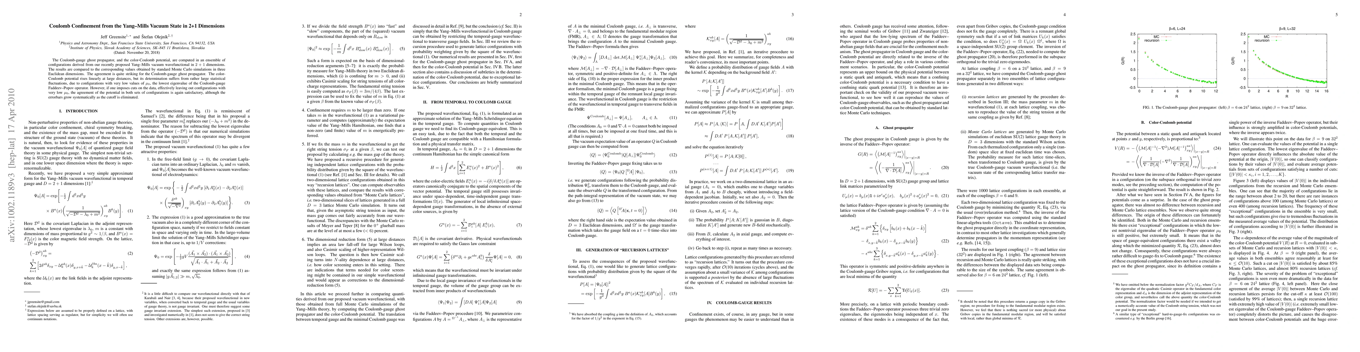 Researchers computed Coulomb-gauge ghost propagator and color-Coulomb potential in 2+1 dimensions using a proposed Yang-Mills vacuum wavefunctional, achieving agreement with Monte Carlo simulations in 3D.