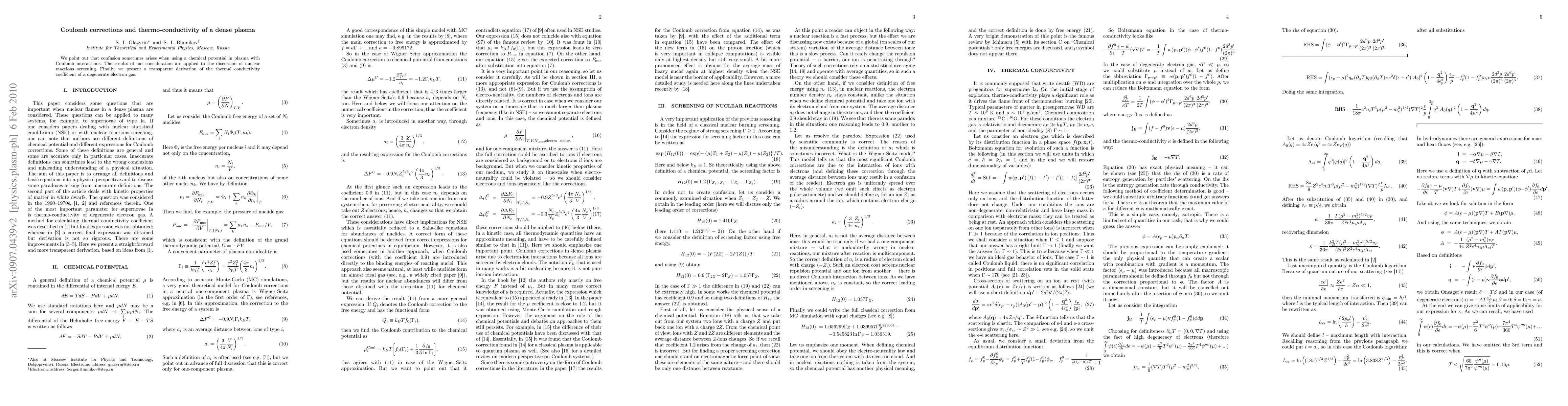 We point out that confusion sometimes arises when using a chemical potential in plasma with Coulomb interactions. The results of our consideration are applied to the discussion of nuclear reactions screening. Finally, we present a transparent derivation of the thermal conductivity coefficient of a degenerate electron gas.