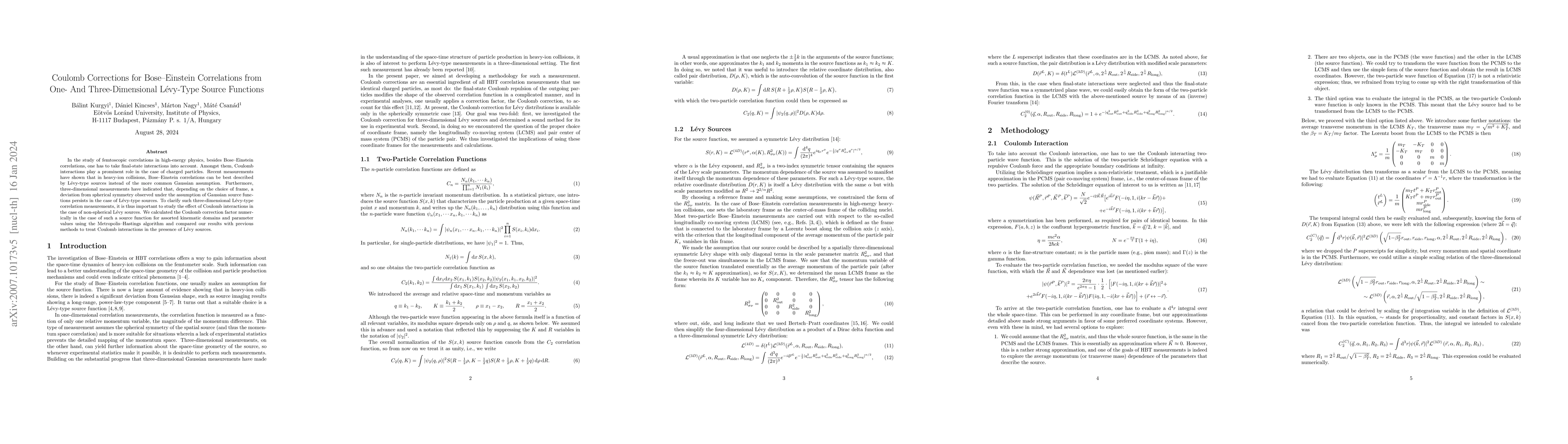 This paper investigates Coulomb corrections for Bose-Einstein correlations in heavy-ion collisions using L\'evy-type source functions, finding that Coulomb interactions significantly affect correlations even when L\'evy sources are employed, particularly in three-dimensional measurements. Numerical calculations using the Metropolis--Hastings algorithm reveal deviations from spherical symmetry and provide a correction factor compared to previous methods.