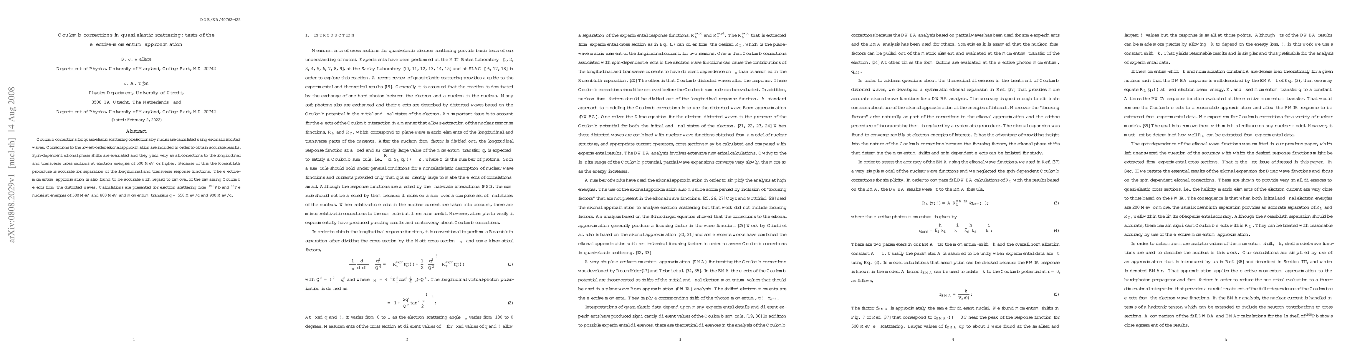 This paper investigates Coulomb corrections in quasi-elastic electron-nucleus scattering using eikonal distorted waves, finding minimal spin-dependent eikonal phase shifts at high energies. The effective-momentum approximation effectively removes remaining Coulomb effects, validating the Rosenbluth separation method for longitudinal and transverse response functions.