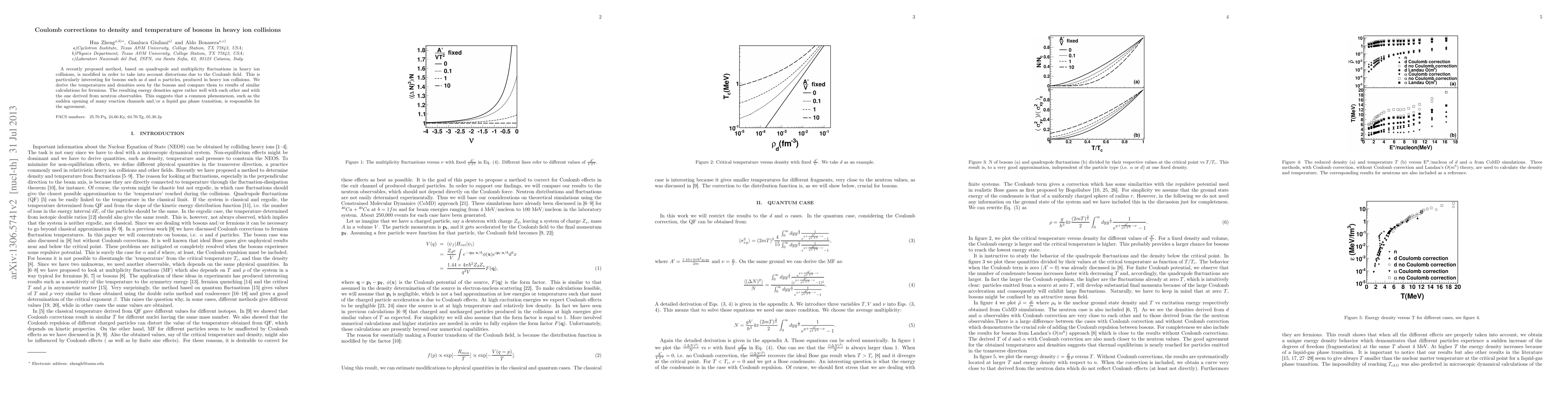 A recently proposed method, based on quadrupole and multiplicity fluctuations in heavy ion collisions, is modified in order to take into account distortions due to the Coulomb field. This is particularly interesting for bosons produced in heavy ion collisions, such as $d$ and $\alpha$ particles. We derive temperatures and densities seen by the bosons and compare to similar calculations for fermions. The resulting energy densities agree rather well with each other and with the one derived from neutrons. This suggests that a common phenomenon, such as the sudden opening of many reaction channels and/or a liquid gas phase transition, is responsible for the agreement.